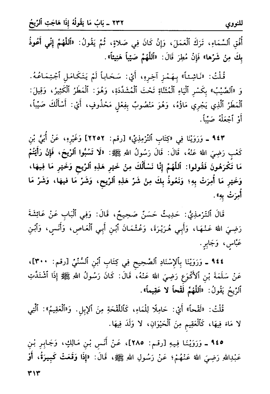 943- وروينا في "كتاب الترمذي" [رقم: 2252] وغيره، عن أُبيّ بن كعب رضي الله عنه، قال: قال رسول الله صلى الله عليه وسلم: "لا تَسُبُّوا الرّيحَ، فإنْ رأيْتُمْ ما تَكْرَهُونَ فَقُولوا: اللَّهُمَّ إنَّا نَسألُكَ مِنْ خَيْرِ هَذِهِ الرّيحِ وخَيْرِ ما فِيها، وَخَيْرِ ما أُمرت بِهِ؛ وَنَعُوذُ بِكَ مِنْ شَرّ هَذِهِ الرّيحِ، وَشَرّ ما فِيهَا، وَشَرّ ما أُمِرَتْ بِهِ".