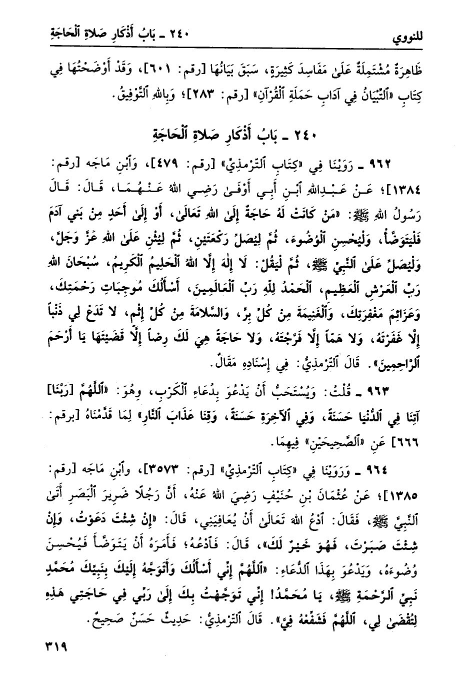 962- روينا في "كتاب الترمذي" [رقم: 479] ، وابن ماجه [رقم: 1384] ؛ عن عبد الله بن أبي أوفى رضي الله عنهما، قال: قال رسول الله صلى الله عليه وسلم: "من كَانَتْ لَهُ حَاجَةٌ إلى اللَّهِ تَعالى، أوْ إلى أحدٍ مِن بَني آدَمَ فَلْيَتَوَضَّأ، وليُحسن الوُضُوءِ، ثُمَّ ليُصَلّ رَكْعَتَيْنِ، ثمَّ لِيُثْنِ على الله عَزَّ وَجَلَّ، وَلْيُصَلّ على النَّبِيّ صلى الله عليه وسلم، ثُمَّ ليَقُلْ: لا إِلهَ إِلاَّ الله الحَلِيمُ الكَرِيمُ، سُبْحانَ اللَّه رَبّ العَرْشِ العظيم، الحمدُ لله رب العالمين، أسألُكَ مُوجِباتِ رَحْمَتِكَ، وَعَزَائِمَ مَغْفِرَتِكَ، وَالغَنِيمَةَ مِنْ كُلّ بِرّ، وَالسَّلامَةَ مِنْ كُلّ إثْمٍ، لا تَدَعْ لِي ذَنْباً إِلاَّ غفرتهُ، وَلا هَمَّاً إِلاَّ فرجتهُ، وَلا حاجَةً هِيَ لَكَ رِضاً إِلاَّ قَضَيْتَها يا أرْحَمَ الرَّاحِمِينَ". قال الترمذي: في إسناده مقالٌ.
