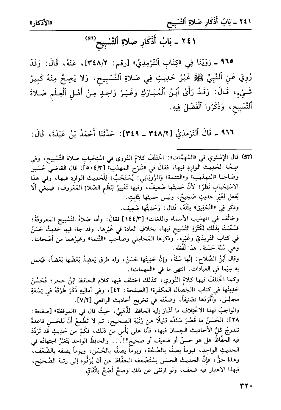 965- روينا في "كتاب الترمذي" [رقم: 2/ 348] ، عنهُ، قال: وقد روي عن النبي صلى الله عليه وسلم غيرُ حديثٍ في صلاة التسبيح، ولا يصح منه كبير شيءٍ، قال: وقد رأى ابنُ المبارك وغيرُ واحدٍ من أهل العلم صلاة التسبيح، وذكروا الفضل فيه.