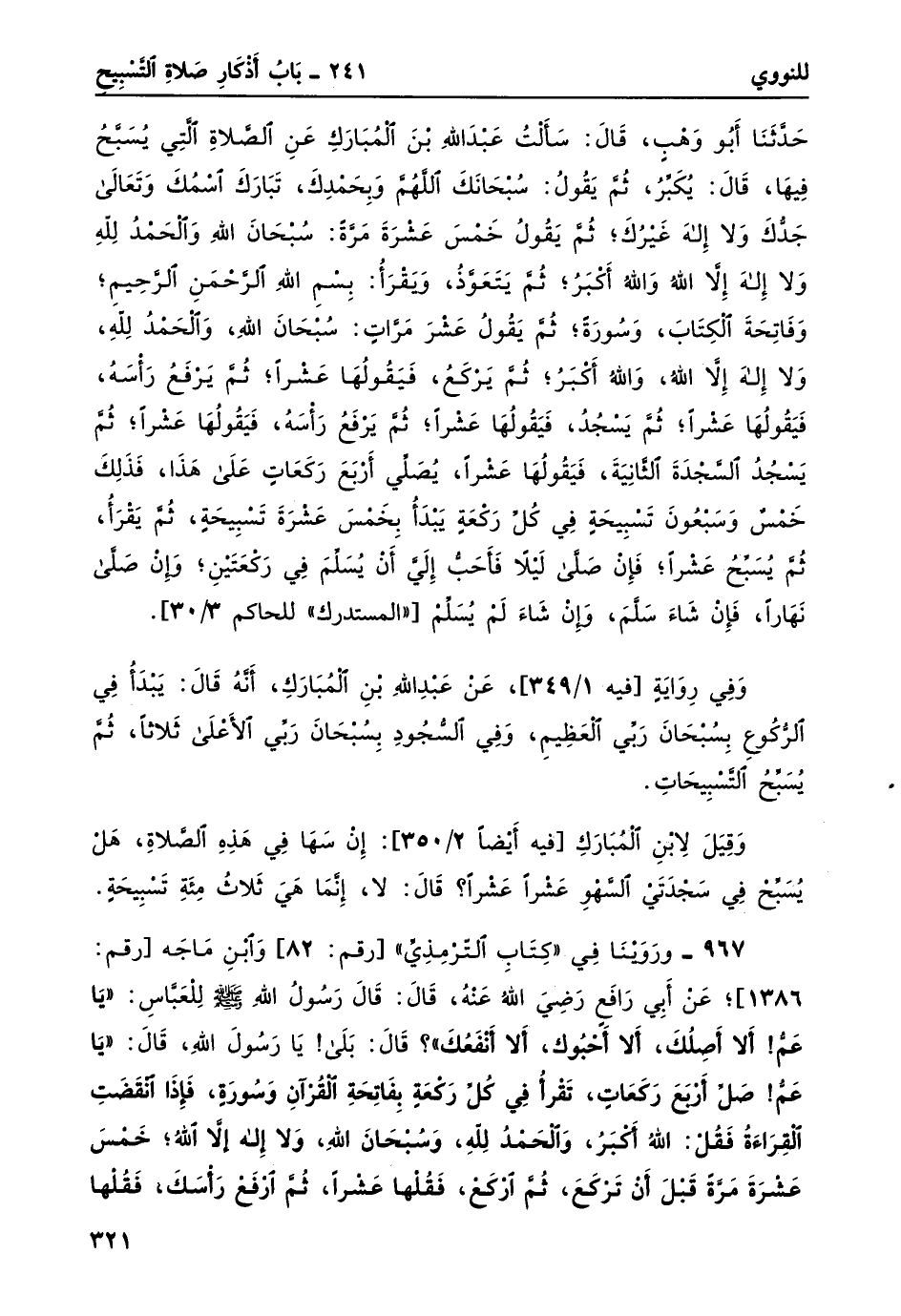 967- وروينا في "كتاب الترمذي" [رقم: 82] وابن ماجه [رقم: 1386] ؛ عن أبي رافع رضي الله عنهُ، قال: قال رسولُ الله صلى الله عليه وسلم للعباس: "يا عَمُّ! ألا أصلُك، ألا أحبُوك، ألا أنفعُك"؟ قال: بلى! يا رسول الله، قال: "يا عَمّ؟! صَلّ أرْبَعَ رَكعَاتٍ، تَقْرأُ فِي كُلّ رَكْعَةٍ بِفاتِحَةِ القُرآنِ وَسُورَةٍ، فإذَا انْقَضَتِ القِرَاءةُ فَقُلِ: اللَّهُ أكبرُ، والحمدُ لِلَّهِ، وسبحانَ اللَّهِ، وَلا إِلهَ إِلاَّ اللَّهِ؛ خَمْسَ عَشْرَةَ مَرَّةً قَبْلَ أنْ تَرْكَعَ، ثُمَّ ارْكَعْ، فَقُلْها عَشْراً، ثُمَّ افرع رأسَكَ، فَقُلْها