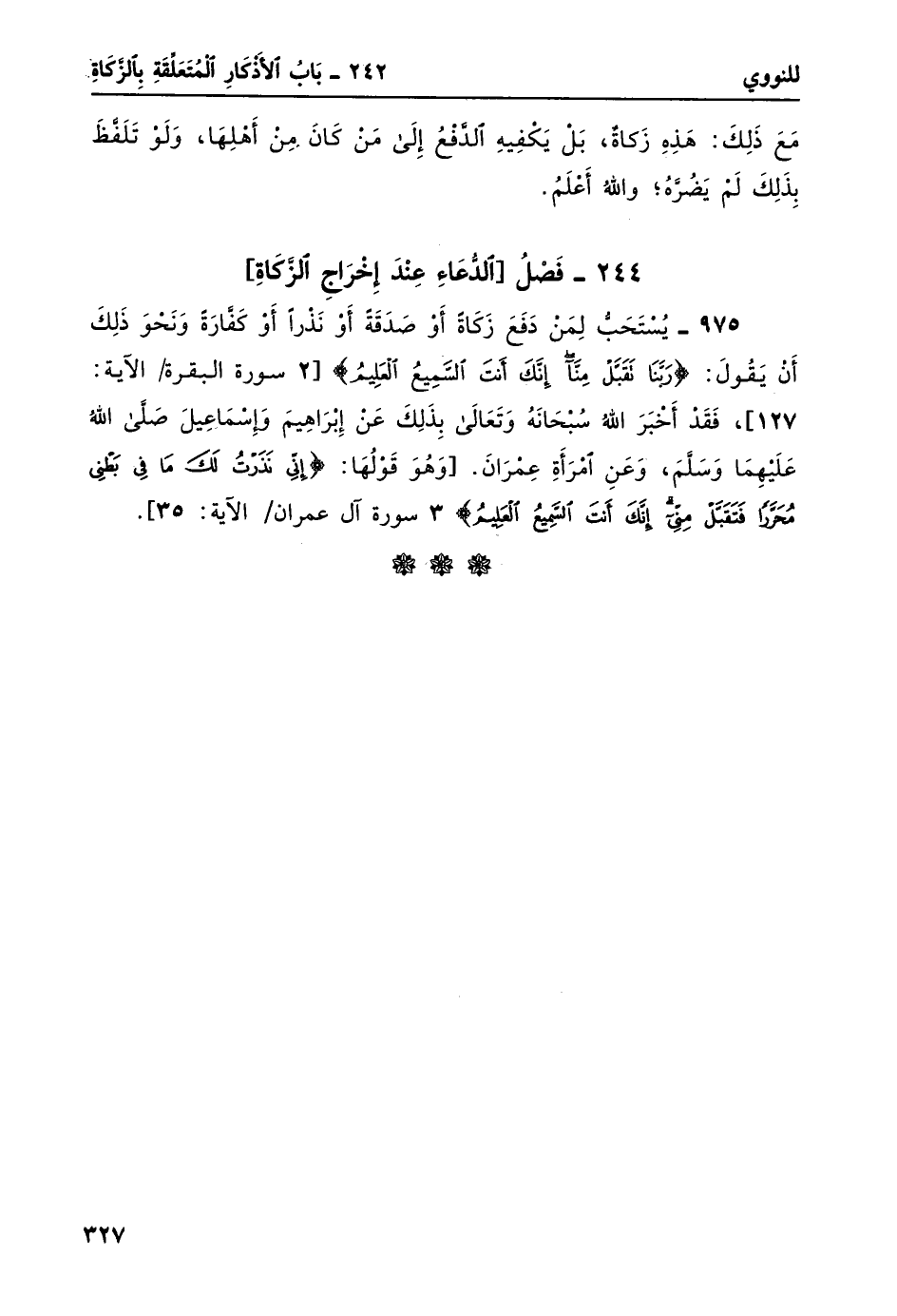 975- يُستحبّ لمن دفع زكاةً أو صدقةً أو نذراً أو كفّارةً ونحوَ ذلك أن يقول: {رَبَّنَا تَقَبَّلْ مِنَّا إِنَّكَ أَنْتَ السَّمِيعُ الْعَلِيمُ} [البقرة: 127] ، فقد أخبرَ الله سبحانهُ وتعالى بذلك عن إبراهيم وإسماعيل صلى الله عليهما وسلم، وعن امرأة عمران. وهو قولها: {إِنِّي نَذَرْتُ لَكَ مَا فِي بَطْنِي مُحَرَّرًا فَتَقَبَّلْ مِنِّي إِنَّكَ أَنْتَ السَّمِيعُ الْعَلِيمُ} [آل عمران: 35] .