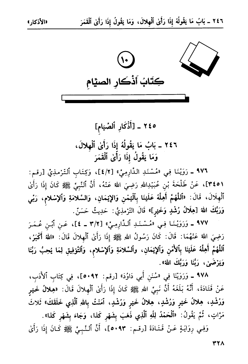 976- روينا في "مسند الدارمي" [2/ 4] ، و"كتاب الترمذي" [رقم: 3451] ، عن طلحة بن عبيد الله رضي الله عنهُ، أن النبي صلى الله عليه وسلم كان إذا رأى الهلال، قال: "اللَّهُمَّ أهلهُ عَلَيْنا باليمنِ وَالإِيمانِ، وَالسَّلامَةِ وَالإِسْلامِ، رَبِّي وربك الله [هلالُ رشدٍ وخيرٍ] ". قال الترمذي: حديثٌ حسنٌ.
