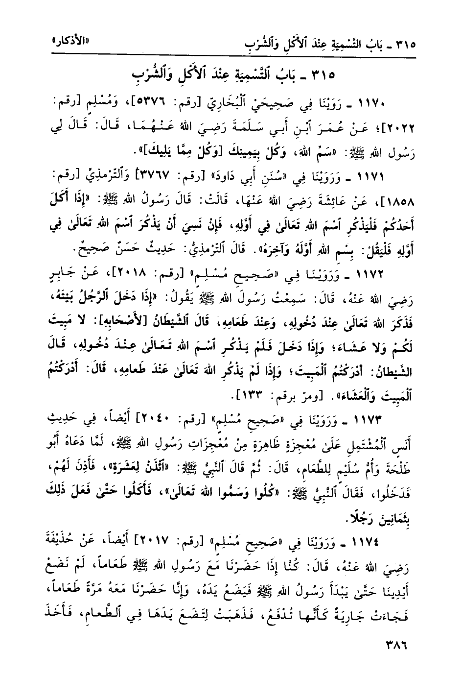 1170- رَوَيْنَا في صحيحي البخاري [رقم: 5376] ، ومسلم [رقم: 2022] ؛ عن عمر بن أبي سلمة رضي الله عنهما، قال: قال لي رسول الله صلى الله عليه وسلم: "سَمِّ اللَّهَ، وَكُلْ بِيَمِينِكَ وكل مما يليك".