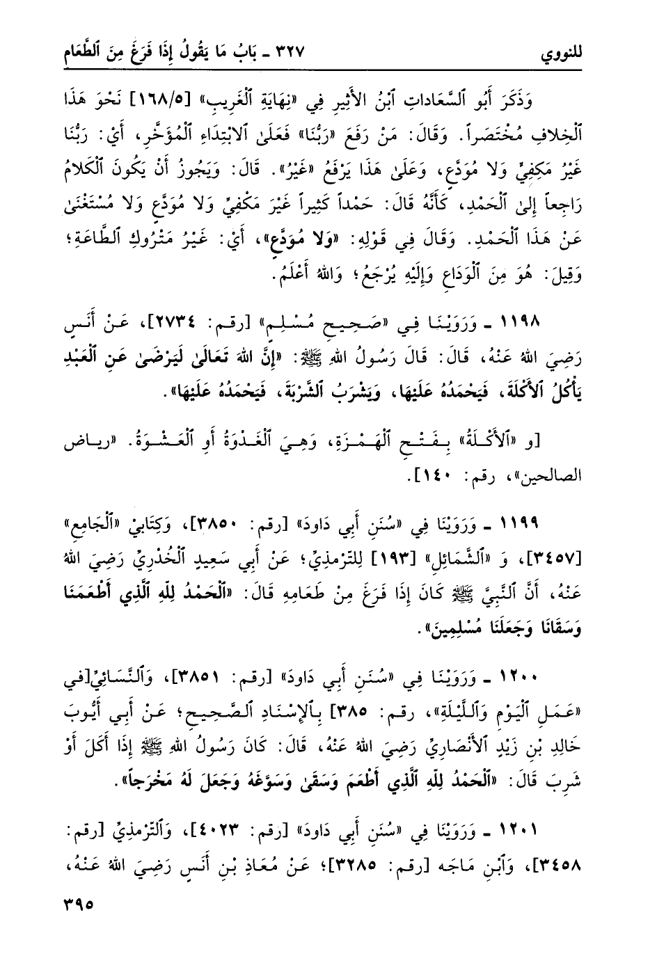 1199- وَرَوَيْنَا في "سنن أبي داود" [رقم: 3850] ، وكتابي "الجامع" [3457] ، و"الشمائل" [193] للترمذي؛ عن أبي سعيد الخدري رضي الله عنه، أن النبي صلى الله عليه وسلم كان إذا فَرَغ من طعامه قال: "الحمدُ لِلَّهِ الَّذي أطْعَمَنا وَسَقَانا وَجَعَلَنا مُسْلِمِينَ".