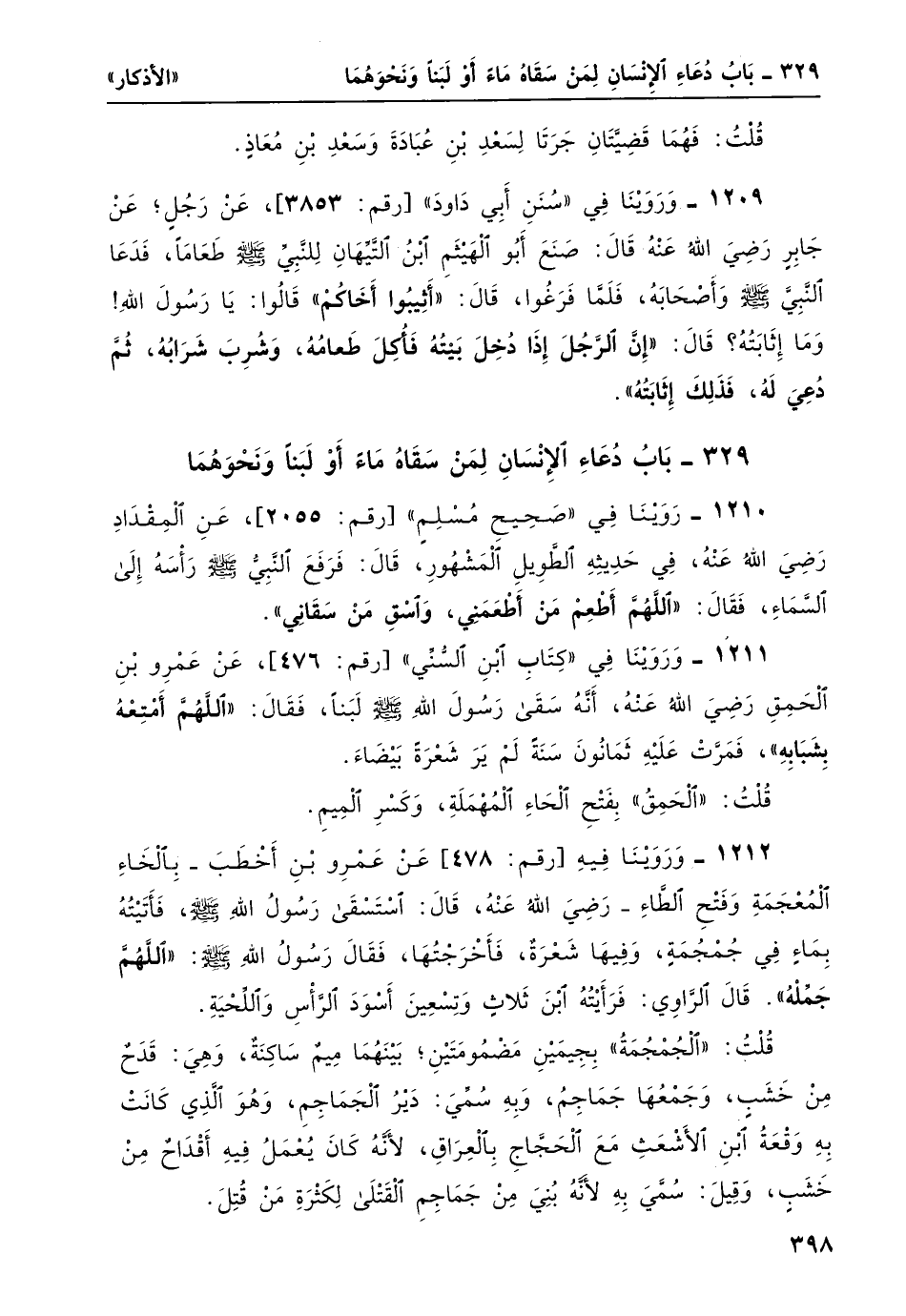 1210- رَوَيْنَا في "صحيح مسلم" [رقم: 2055] ، عن المقداد رضي الله عنه، في حديثه الطويل المشهور، قال: فرفعَ النبيُّ صلى الله عليه وسلم رأسَه إلى السماء، فقال: "اللَّهُمَّ أطْعِمْ مَنْ أطْعَمَنِي، وَاسْقِ مَنْ سَقانِي".