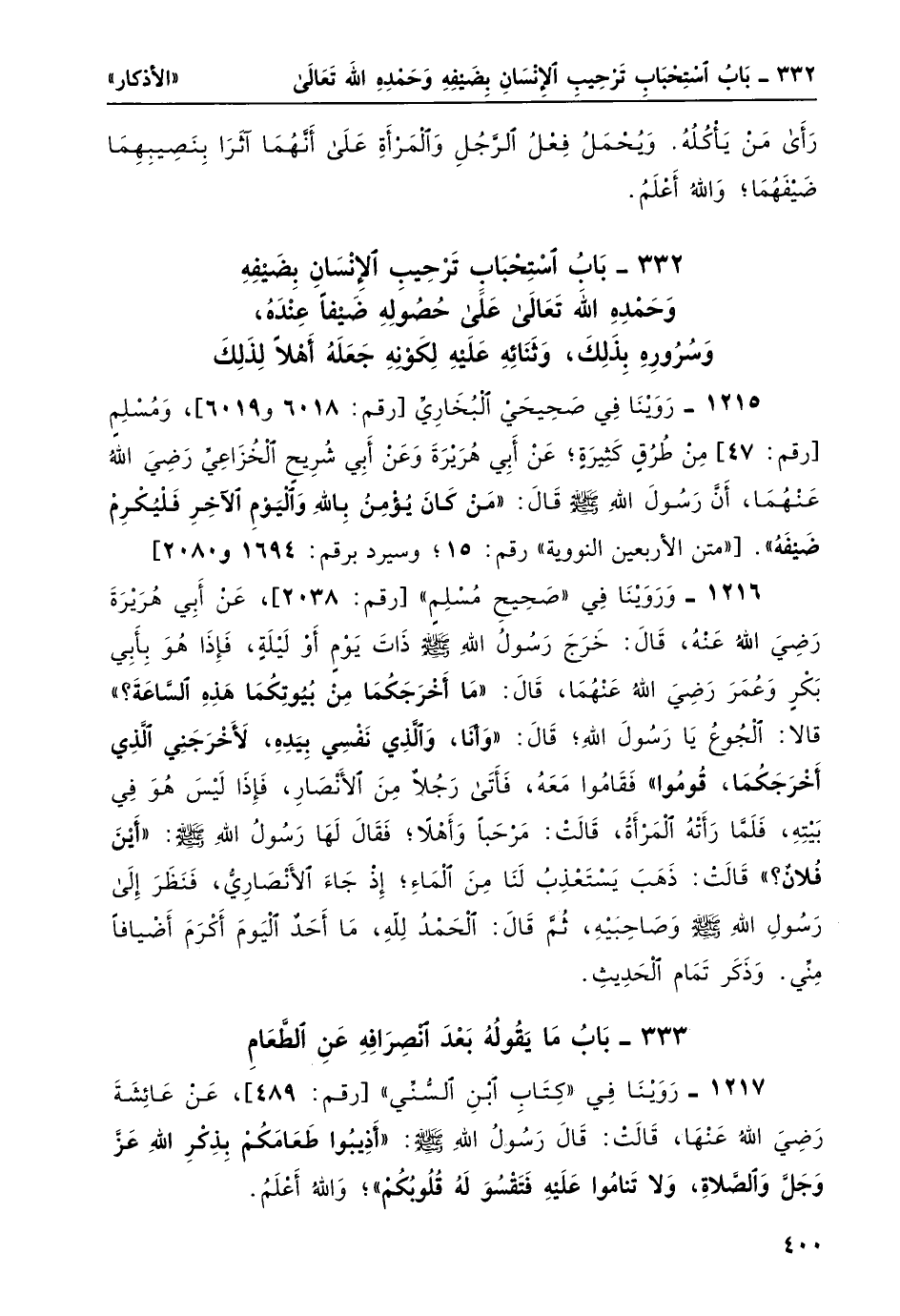 بابُ استحباب ترحيب الإِنسان بضيفه وحمده الله تعالى على حُصُوله ضيفاً عندهُ، وسروره بذلك، وثنائه عليه لكونه جعلَه أهلاً لذلك: