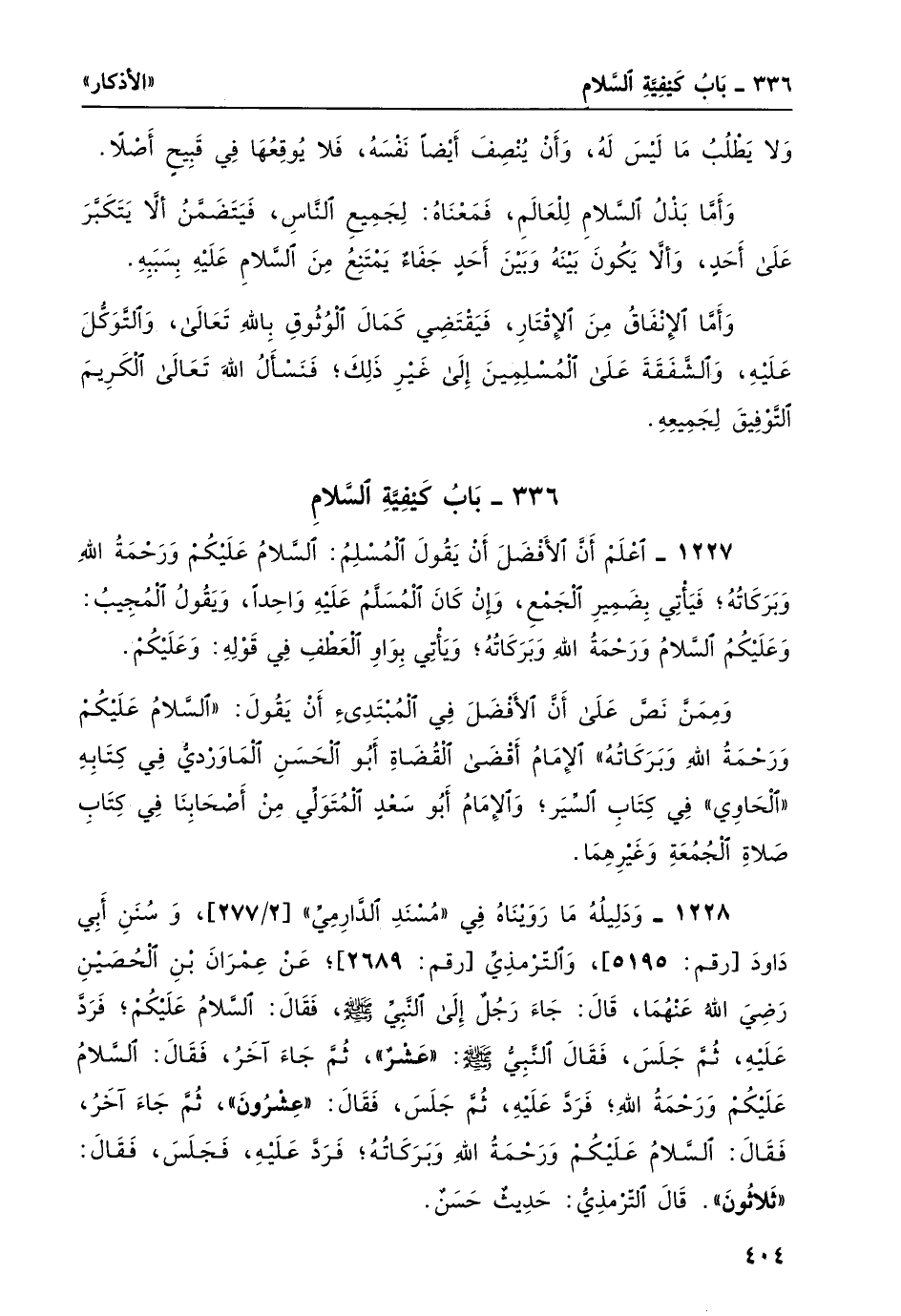 1228- ودليله ما رويناه في مسند الدارمي [2/ 277] ، وسنن أبي داود [رقم: 5195] ، والترمذي [رقم: 2689] ؛ عن عمران بن الحصين رضي الله عنهما، قال: جاء رجلٌ إلى النبيّ صلى الله عليه وسلم، فقال: السلام عليكم؛ فزد عليه، ثم جلس، فقال النبيّ صلى الله عليه وسلم: "عشرٌ"، ثم جاء آخر، فقال: السلام عليكم ورحمة الله؛ فردّ عليه، ثم جلس، فقال: "عِشْرُونَ"، ثم جاء آخر، فقال: السلام عليكم ورحمة الله وبركاتُه؛ فردّ عليه، فجلس، فقال: "ثلاثُون". قال الترمذي: حديثٌ حسنٌ.