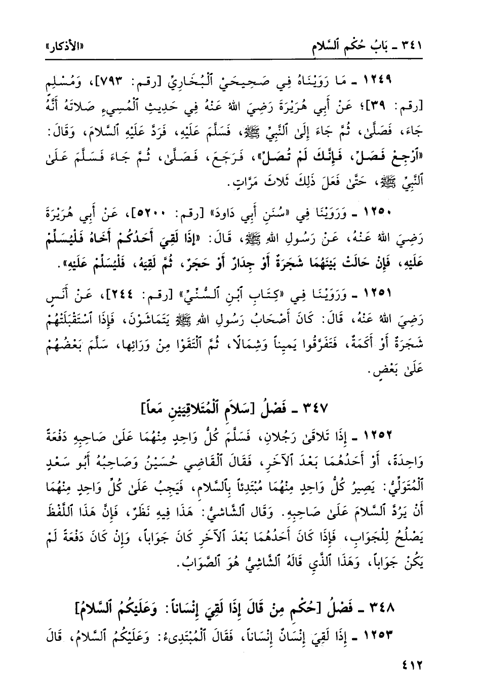 1248- إذا سُلِّم عليه إنسانٌ، ثم لقيهُ على قربٍ، يُسنُ لهُ أن يسلمَ عليهِ ثانياً وثالثاً وأكثر، اتَّفق عليه أصحابُنا، ويدلُ عليهِ: