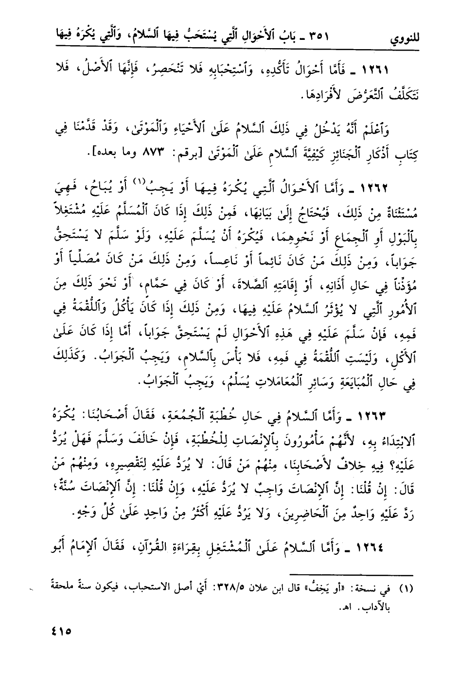 1262- وأما الأحوال التي يُكره فيها أو يجب1 أو يُباح، فهي مستثناهٌ من ذلكن فيحتاجُ إلى بيانها، فمن ذلك إذا كان المسلمُ عليه مشتغلاً بالبول أو الجماع أونحوهما، فيُكره أن يُسلَّم عليه، ولو سلَّم لا يستحقّ جواباً، ومن ذلك من كان نائماً أو ناعساً، ومن ذلك من كان مُصلياً أو مؤذناً في حال أذانه، أو إقامته الصلاةَ، أو كان في حمام، أو نحو ذلك من الأمور التي لا يُؤثر السلام عليه فيها، ومن ذلك إذا كان يأكلُ واللقمة في فمه، فإن سلَّم عليه في هذه الأحوال لم يستحقَّ جواباً، أما إذا كان على الأكل، وليست اللقمةُ في فمه، فلا بأسَ بالسلام، ويجبُ الجواب. وكذلك في حال المبايعة وسائر المعاملات يسلمن ويجب الجواب.