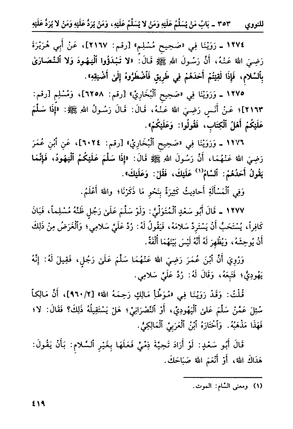 1276- وَرَوَيْنَا في "صحيح البخاري" [رقم: 6024] ، عن ابن عمر رضي الله عنهما، أن رسول الله صلى الله عليه وسلم قال: "إِذَا سَلَّمَ عَلَيْكُمُ اليَهُودُ، فإنَّمَا يقولُ أحدُهُم: السَّامُ 1 عَلَيْكَ، فَقُلْ: وَعَلَيْكَ".