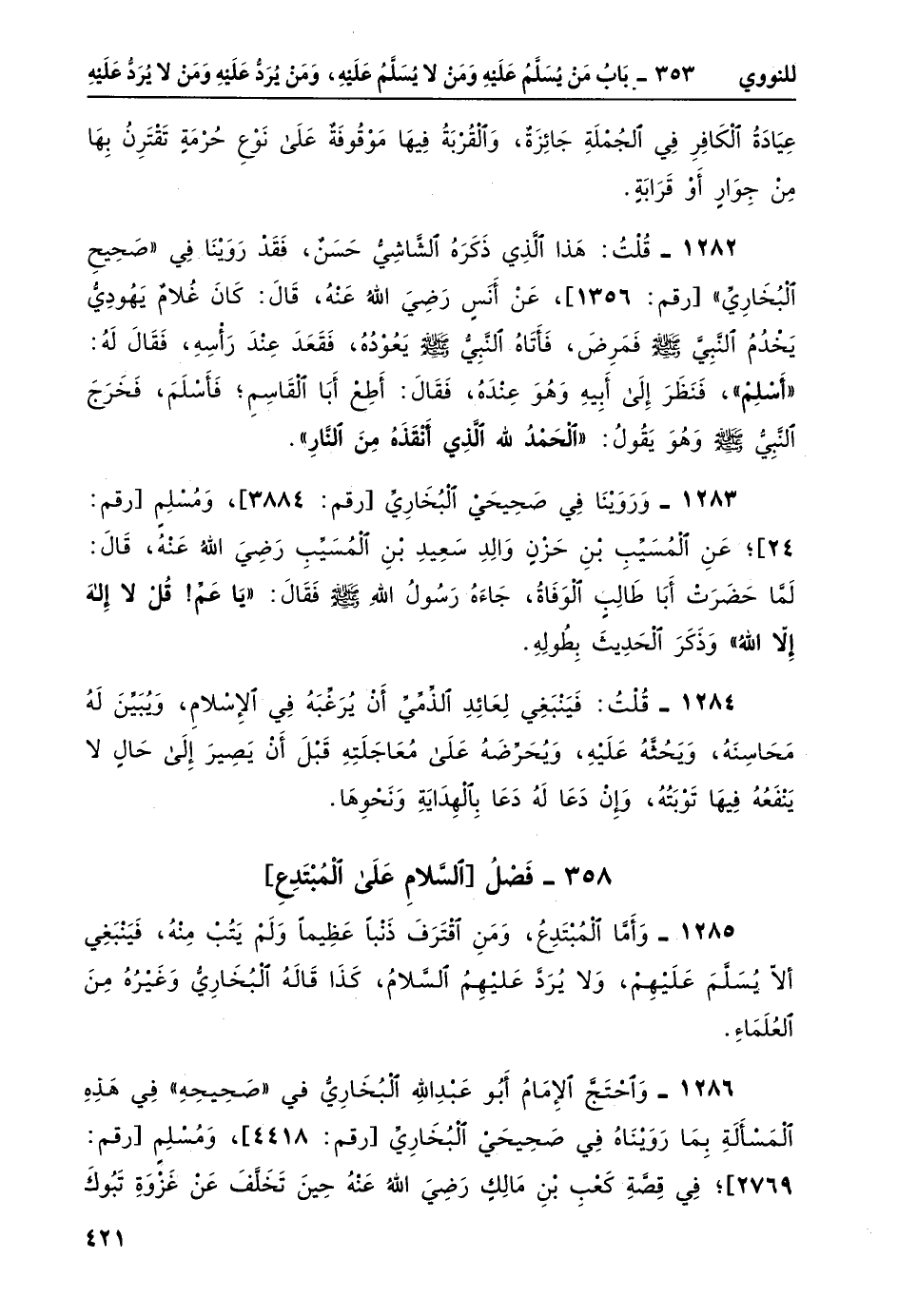 1284- قُلتُ: فينبغي لعائدِ الذميّ أن يرغبهُ في الإِسلام، ويبينَ لهُ محاسنهُ، ويحثهُ عليهِ، ويحرضهُ على معاجلته قبل أن يصيرَ إلى حالٍ لا ينفعهُ فيها توبتهُ، وإن دعا له دعا بالهداية ونحوها.