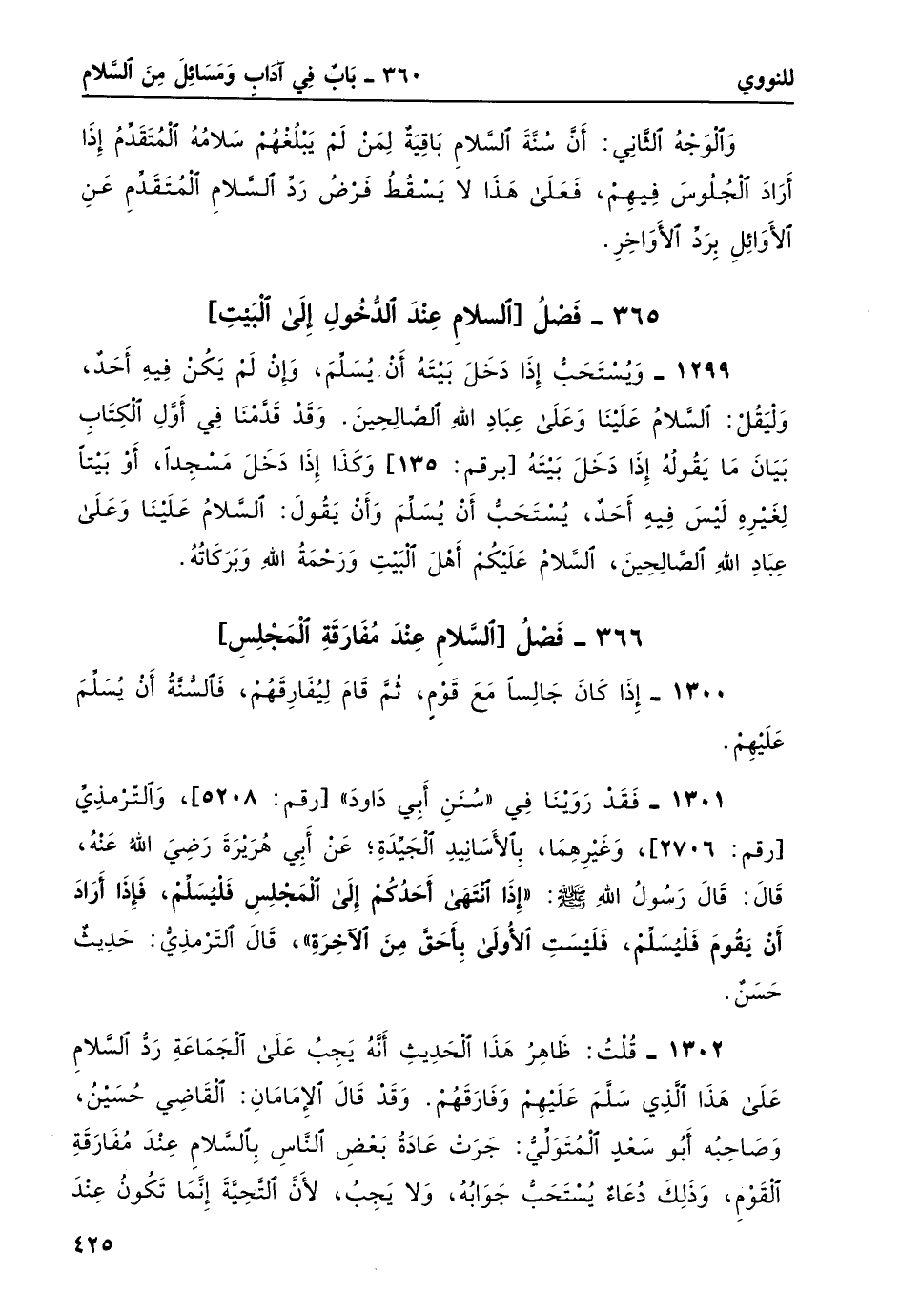 1301- فقد رَوَيْنَا في "سنن أبي داود" [رقم: 5208] ، والترمذي [رقم: 2706] ، وغيرهما، بالأسانيد الجيدة؛ عن أبي هريرة رضي الله عنه، قال: قال رسول الله صلى الله عليه وسلم: "إذا انْتَهَى أحَدُكُمْ إلى المَجْلِسِ فليُسلم، فإذَا أَرَادَ أنْ يَقُومَ فليُسلم، فَلَيْسَتِ الأُولى بأحَقّ مِنَ الآخِرَةِ"، قال الترمذي: حديثٌ حسنٌ.