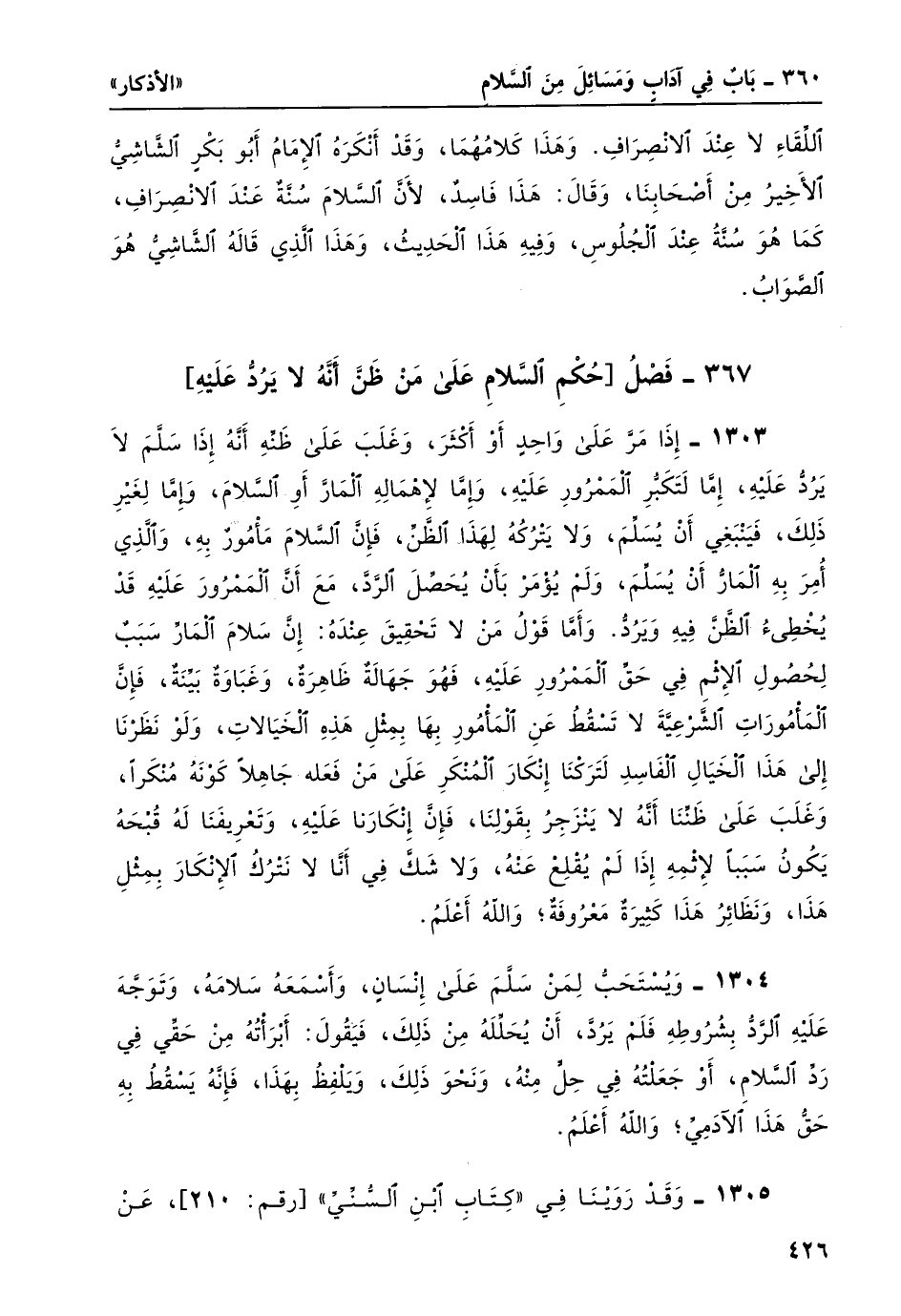 1303- إذا مرّ على واحد أو أكثر، وغلبَ على ظنه أنه إذا سلَّم لا يردّ عليه، إما لتكبرُ الممرور عليه، وإما لإِهماله المارّ أو السلام، وإما لغير ذلك، فينبغي أن يُسلم، ولا يرتكه لهذا الظنّ، فإنّ السلامَ مأمورٌ به، والذي أُمِرَ به المارّ أن يُسلّم، ولم يؤمر بأن يحصل الردّ، مع أن الممرور عليه قد يخطئ الظنّ فيه ويردّ. وأما قولُ مَن لا تحقيق عندهُ: إن سلامَ المارّ سبب لحصول الإِثم في حقّ الممرور عليه، فهو جهالة ظاهرةٌ، وغباوةٌ بيِّنة، فإن المأمورات الشرعية لا تسقط عن المأمور بها بمثل هذه الخيالات، ولو نظرنا إلى هذا الخيال الفاسد لتركنا إنكار المنكر على مَن فعله جاهلاً كونه منكراً، وغلب على ظننا أنه لا ينزجرُ بقولنا، فإن إنكارنا عليه، وتعريفنا له قبحه يكون سبباً لإِثمه إذا لم يقلع عنهُ، ولا شكّ في أنُّا لا نترك الإِنكار بمثلِ هذا، ونظائرُ هذا كثيرةٌ معروفةٌ؛ والله أعلم.