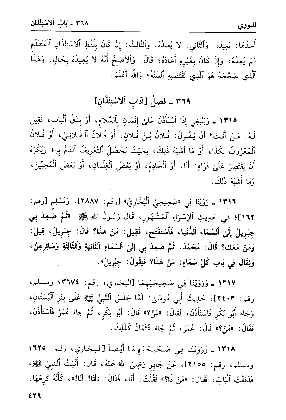 1318- وروينا في صحيحيهما أيضاً البخاري، [رقم: 625] ؛ ومسلم، [رقم: 2155] ، عن جابر رضي الله عنهُ، قال: أتيتُ النبي صلى الله عليه وسلم، فدققتُ البابَ، فقال: "مَنْ ذَا"؟ فقلتُ: أنا، فقال: "أنَا! أنَا! "، كأنه كرهها.