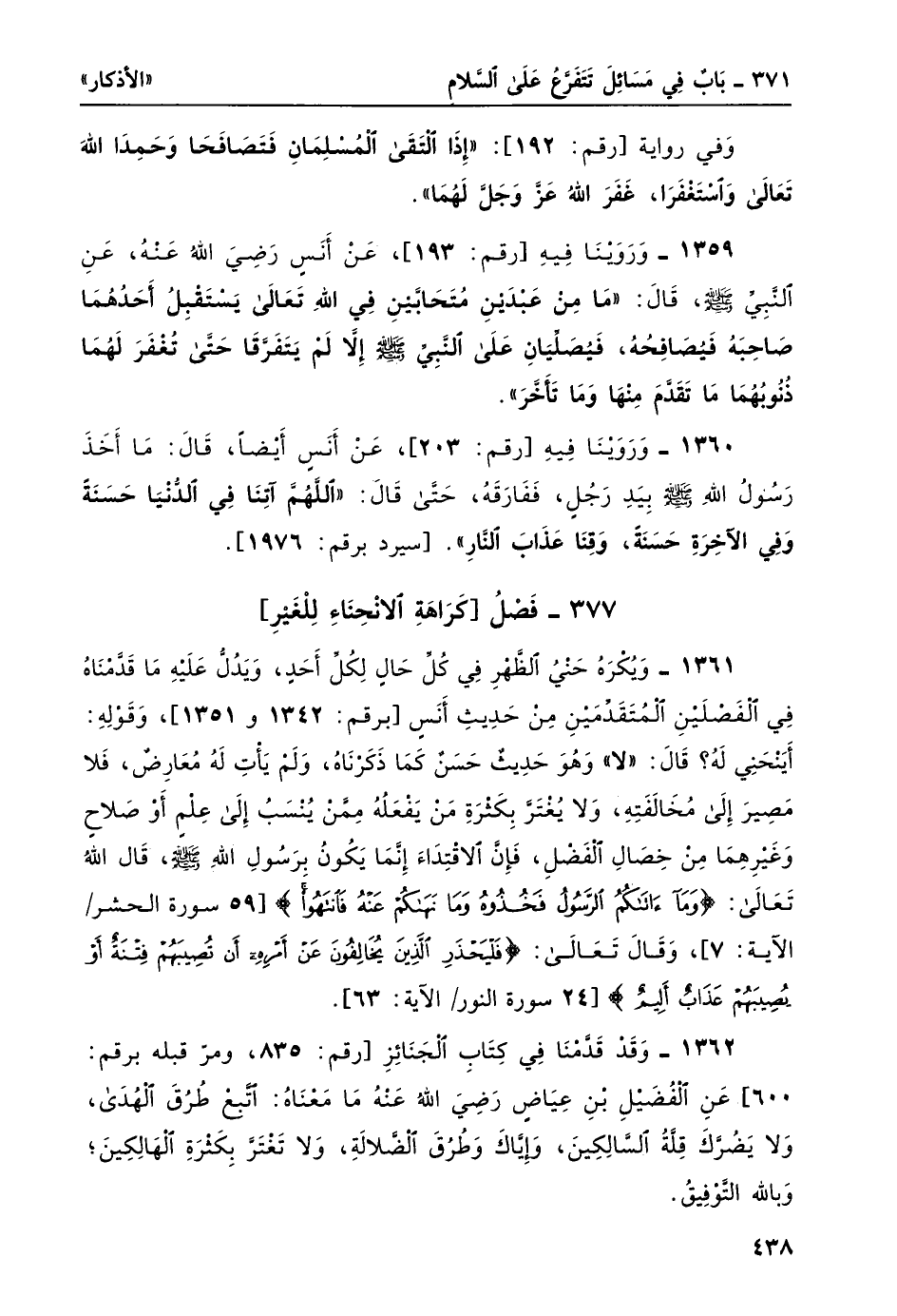 1361- ويكرهُ حَنْيُ الظهرِ في كُل حالٍ لكل أحدٍ، ويدلُ عليهٍ ما قدمناهُ في الفصلين المتقدمين من حديث أنس [برقم: 1342، 1351] ، وقوله: أينحني له؟