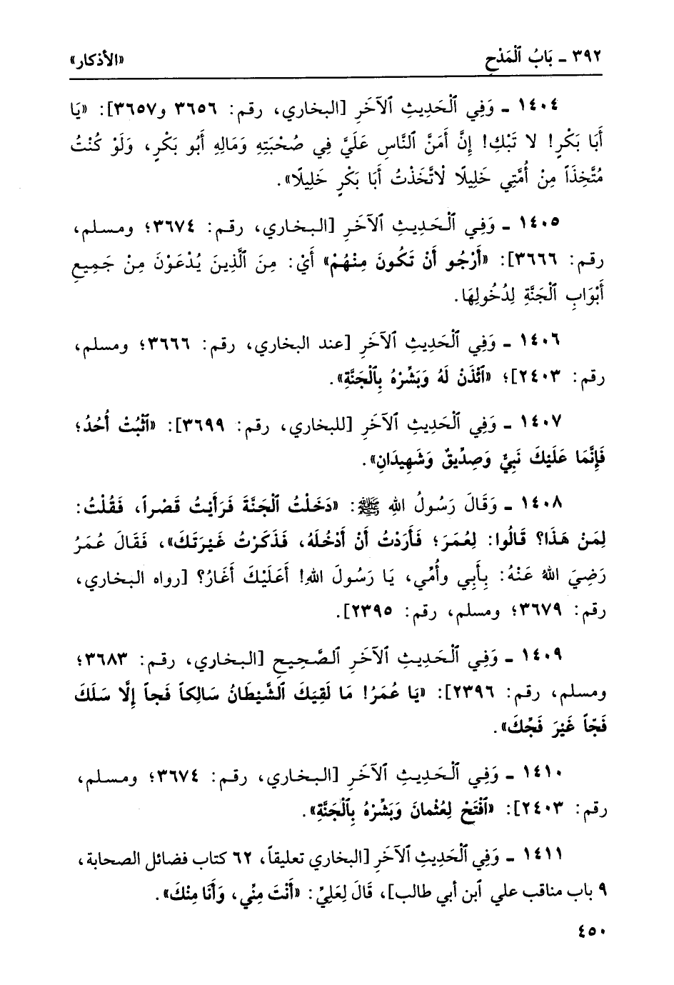 1410- وفي الحديث الآخر [البخاري، رقم: 3674؛ ومسلم، رقم: 2403] : "افْتَحْ لعُثمانَ وبشرهُ بالجنة".