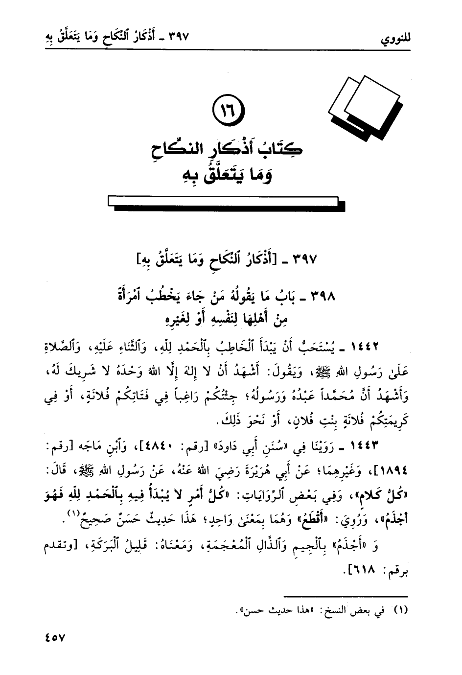 1443- رَوَيْنَا في "سنن أبي داود" [رقم: 4840] ، وابن ماجه [رقم: 1894] ، وغيرهما؛ عن أبي هريرة رضي الله عنهُ، عن رسول الله صلى الله عليه وسلم، قال: "كُلُّ كَلامٍ"، وفي بعض الروايات: "كُلُ أمرٍ لا يبدأُ فِيهِ بالحَمْد لِلَّهِ فَهُوَ أجْذَمُ"، وروي: "أقطعُ" وهُما بمعنى واحدٍ؛ هذا حديثٌ حسنٌ صحيحٌ1.