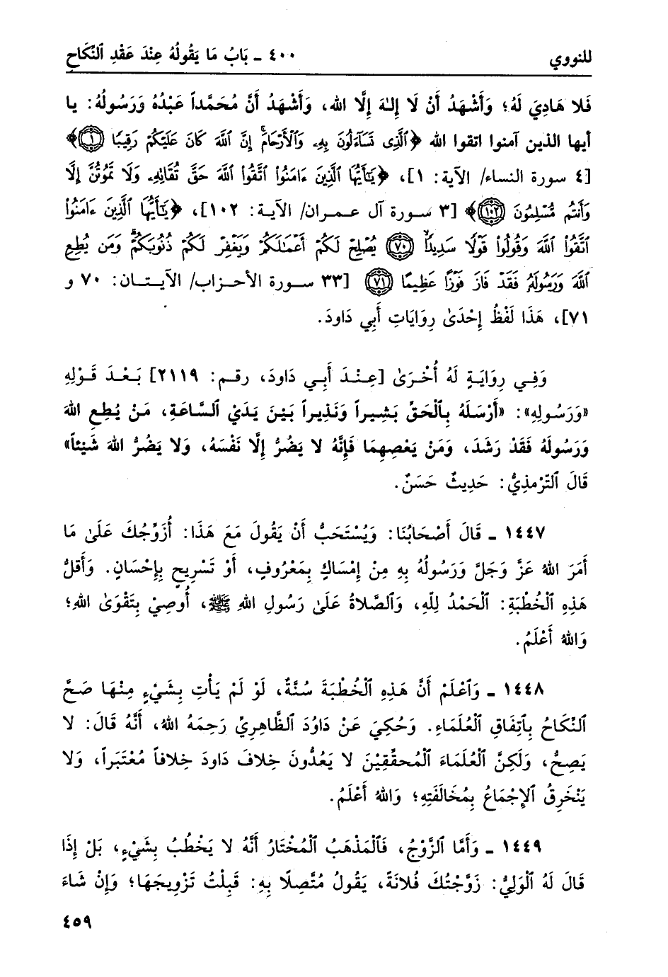 1447- قال أصحابُنا: ويُستحبُّ أن يقول مع هذا: أُزوِّجك على ما أمر الله عزوجل ورسوله به من إمساكٍ بمعروفٍ، أو تسريح بإحسان. وأقلّ هذه الخطبة: الحمدُ لِلَّهِ، والصلاةُ على رسُول الله صلى الله عليه وسلم، أُوصِي بِتَقْوَى اللَّهِ؛ والله أعلمُ.