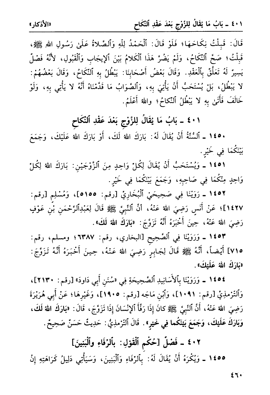 1455- ويكرهُ أن يُقالَ لهُ: بالرفاءِ والبنين، وسيأتي دليلُ كراهته إن شاء الله تعالى في كتابِ حفظ اللسان في آخر الكتاب [رقم: 1855؛ الباب، رقم: 543] .