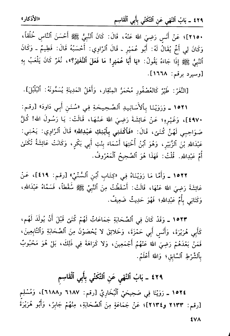 1521- وَرَوَيْنَا بالأسانيد الصحيحة في "سنن أبي داود" [رقم: 4970] ، وغيره؛ عن عائشة رضي الله عنها، قالت: يا رسول الله! كلُّ صواحبي لهنّ كُنى، قال: "فاكْتَنِي بابْنِكَ عَبْدِ الله" قال الراوي: يعني: عبد الله بن الزبير، وهو ابن أختها أسماء بنتِ أبي بكرٍ، وكانت عائشةُ تُكنى أُمّ عبد الله. قلتُ: فهذا هو الصحيح المعروف.