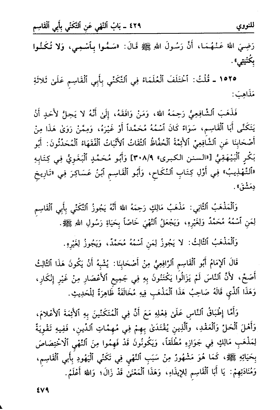 1525- قلتُ: اختلفَ العلماءُ في التكنّي بأبي القاسم على ثلاثة مذاهب: