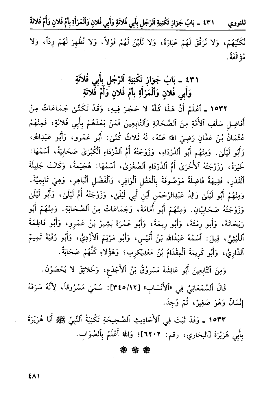 1532- اعلم أن هذا كلهُ لا حجرَ فيهِ، وقد تكنَّى جماعاتٌ من أفاضل سلف الأمة من الصحابة والتابعين فمن بعدهم بأبي فلانةٍ، فمنهم عثمان بن عفانٍ رضي الله عنهُ، له ثلاثُ كُنى: أبو عمرو، وأبو عبد الله، وأبو ليلى. ومنهم أبو الدرداء، وزوجتهُ أُمّ الدرداء الكبرى صحابيةٌ، اسمُها: خيرةُ، وزوجتهُ الأخرى أُمّ الدرداءِ الصغرى، اسمها: هجيمةُ، وكانت جليلة القدرِ، فقيهة فاضلة موصوفة بالعقلِ الوافرِ، والفضل الباهر، وهي تابعية. ومنهم أبو ليلى والدُ عبد الرحمنِ ابنِ أبي ليلى، وزوجتهُ أُمّ ليلى، وأبو ليلى وزوجتهُ صحابيان. ومنهم أبو أمامةَ، وجماعاتُ من الصحابة. ومنهم أبو ريحانةَ، وأبو رمثةَ، وأبو رِيْمة، وأبو عَمْرة بشيرُ بن عمرو، وأبو فاطمة الليثي، قيل: اسمه عبد الله بن أُنيسٍ، وأبو مريم الأزدي، وأبو رُقَيَّة تميم الداري، وأبو كريمة المقدام بن معديكرب؛ وهؤلاء كلُّهم صحابةٌ.