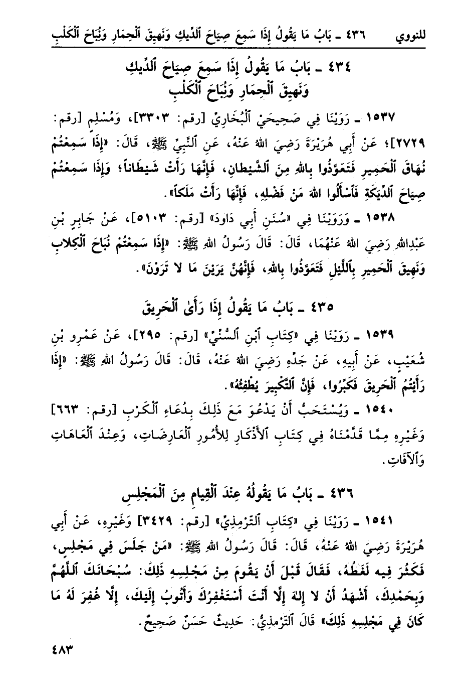 1538- وَرَوَيْنَا في "سنن أبي داود" [رقم: 5103] ، عن جابر بن عبد الله رضي الله عنهما، قال: قال رسول الله صلى الله عليه وسلم: "إذَا سَمِعْتُمُ نُباحَ الكِلابِ وَنَهِيقَ الحَمِيرِ باللَّيْلِ فَتَعَوَّذُوا باللَّهِ، فإنَّهُنَّ يَرَيْنَ ما لا تَرَوْنَ".
