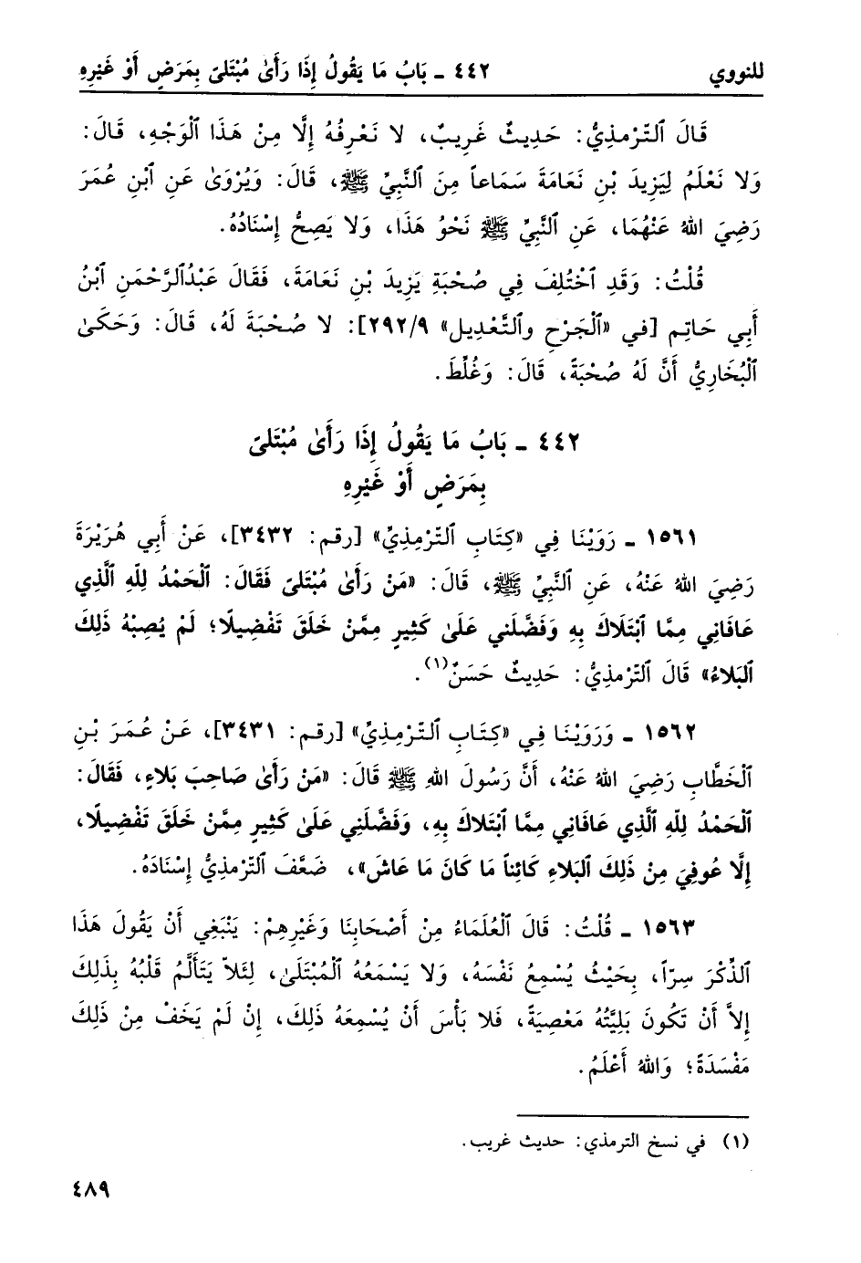 1562- وَرَوَيْنَا في "كتاب الترمذي" [رقم: 3431] ، عن عمر بن الخطاب رضي الله عنهُ، أن رسول الله صلى الله عليه وسلم قال: "مَنْ رأى صَاحِبَ بلاءٍ، فَقالَ: الحمدُ للهِ الَّذي عافانِي مما ابتلاك به، وَفَضَّلَنِي على كثيرٍ مِمَّنْ خَلَقَ تَفضِيلاً، إِلاَّ عُوفي مِنْ ذلكَ البَلاءِ كائِناً ما كانَ ما عاش"، ضَعَّفَ الترمذي إسنادَه.