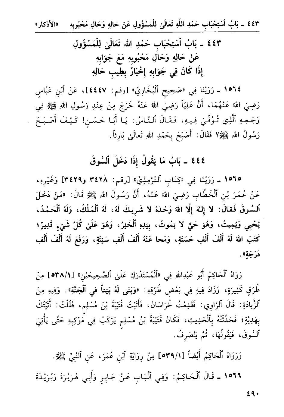 1565- رَوَيْنَا في "كتاب الترمذي" [رقم: 3428، 3429] وغيره، عن عمرَ بن الخطاب رضي الله عنهُ، أن رسول الله صلى الله عليه وسلم قال: "مَنْ دَخَلَ السُّوقَ فَقالَ: لا إِلهَ إِلاََّ اللَّهُ وَحْدَهُ لا شَريكَ لهُ، لَهُ المُلْكُ، وَلَهُ الحَمْدُ، يُحْيِي ويُمِيتُ، وَهُوَ حَيٌّ لا يَمُوتُ، بِيَدِهِ الخَيْرُ، وهُو على كُلّ شَيْءٍ قديرٌ؛ كَتبَ اللهُ لَهُ ألْفَ ألْفِ حسنةٍ، وَمَحَا عنهُ ألْفَ ألْفِ سيئةٍ، وَرَفَعَ لَهُ ألْفَ ألْفِ دَرَجَة".