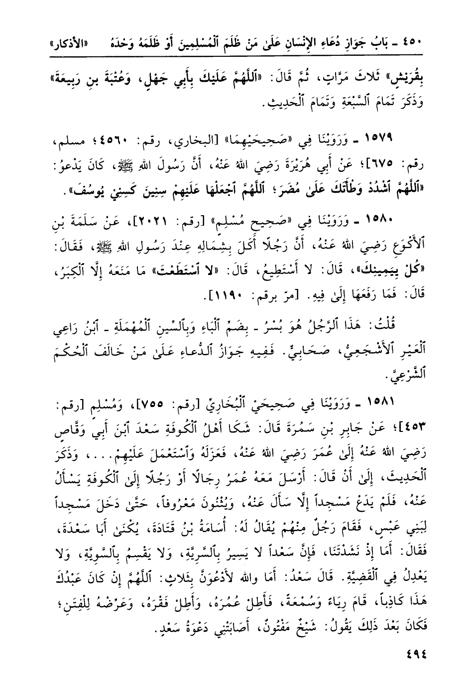 1581- وَرَوَيْنَا في صحيحي البخاري [رقم: 755] ، ومسلم [رقم: 453] ؛ عن جابر بن سمرةَ قال: شكا أهلُ الكوفة سعدَ بن أبي وقاص رضي الله عنه إلى عمر رضي الله عنه، فعزلَه واستعملَ عليهم....، وذكرَ الحديثَ، إلى أن قال: أرسل معهُ عمرُ رجالاً أو رجلاً إلى الكوفة يسألُ عنه، فلم يدعْ مسجداً إلا سألَ عنه، ويُثنون معروفاً، حتى دخل مسجداً لبني عَبْسٍ، فقال رجلٌ منهم يُقال له: أُسامة بن قتادة، يُكنى أبا سعدة، فقال: أما إذ نشدتنا، فإن سعداً لا يسيرُ بالسريّة، ولا يَقسِمُ بالسويّة، ولا يَعدِلُ في القضية. قال سعد: أما والله لأدعونّ بثلاث: اللهمّ إن كان عبدُك هذا كاذباً، قام رياءً وسمعةً، فأطلْ عمرَه، وأطلْ فقرَه، وعرّضْه للفتن، فكانَ بعد ذلك يقول: شيخٌ مفتون، أصابتني دعوةُ سعدٍ.
