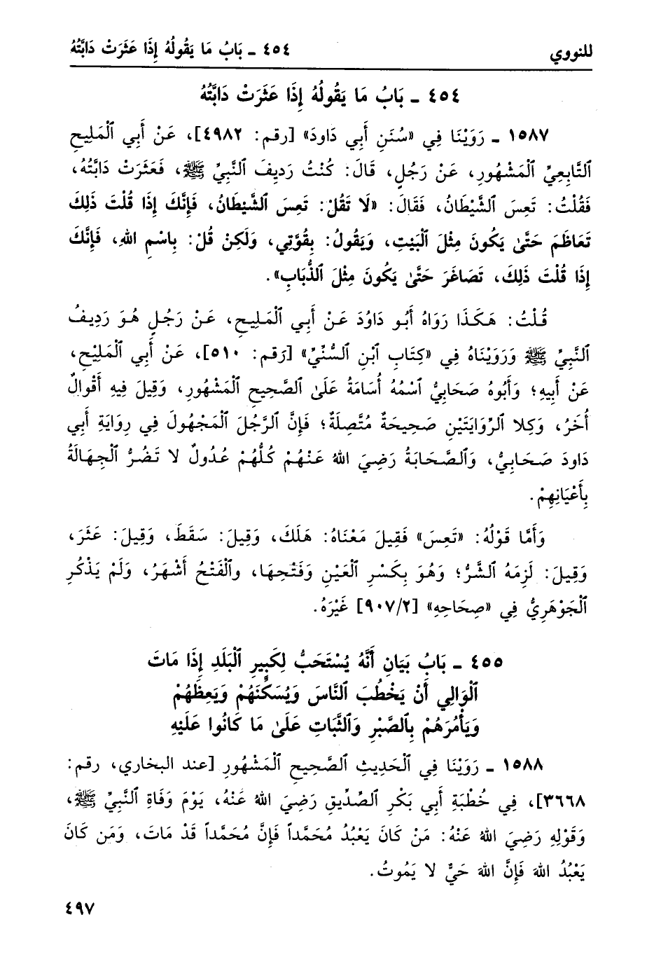 1587- رَوَيْنَا في "سنن أبي داود" [رقم: 4982] ، عن أبي المُلَيْح التابعي المشهور، عن رجل، قال: كنتُ رديفَ النبيّ صلى الله عليه وسلم، فعثرت دابّته، فقلتُ: تَعِس الشيطان، فقال: "لا تَقُلْ: تَعِسَ الشَّيْطانُ، فإنَّكَ إذَا قُلْتَ ذلكَ تَعاظَمَ حتَّى يَكُونَ مِثْلَ البَيْتِ، ويقولُ: بِقُوَّتِي، وَلَكِنْ قُل: باسْمِ اللَّهِ، فإنَّكَ إذَا قلتَ ذلك، تَصَاغَرَ حتى يَكُونَ مِثْلَ الذُّبابِ".