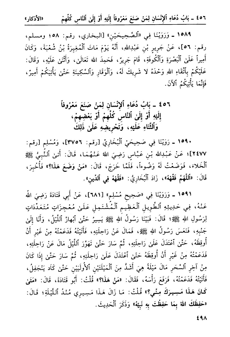 1591- رَوَيْنَا في "صحيح مسلم" [681] ، عن أبي قتادة رضي الله عنهُ، في حديثه الطويل العظيم المشتمل على معجزاتٍ متعدّداتٍ لرسول الله صلى الله عليه وسلم؛ قال: فبينا رسولُ الله صلى الله عليه وسم يسيرُ حتى ابْهَارَّ الليل، وأنا إلى جنبه، فنَعَس رسولُ الله صلى الله عليه وسلم، فمالَ عن راحلته، فأتيتُه فدعَّمتُه من غير أن أوقظهُ، حتى اعتدل على راحلته، ثم سارَ حتى تهوَّر الليلُ مال عن راحلته، فدعَّمتُه من غير أن أوقظه حتى اعتدل على راحلته، ثم سارَ حتى إذا كان من آخر السَّحَر مالَ ميلة هي أشدّ من الميلتين الأُولَيَيْن حتى كاد ينجفلُ، فأتيتُه فدعَّمته، فرفعَ رأسَه، فقال: "مَنْ هَذَا"؟ قلتُ: أبو قتادة، قال: "مَتَى كان هَذَا مَسِيركَ مِنِّي"؟ قلتُ: ما زال هذا مسيري مند الليلة؛ قال: "حَفِظَكَ الله بِما حَفِظْتَ بِهِ نَبِيّهُ" وذكر الحديث.