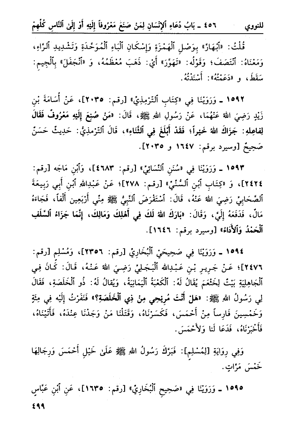 1592- وَرَوَيْنَا في "كتاب الترمذي" [رقم: 2035] ، عن أسامة بن زيدٍ رضي الله عنهما، عن رسول الله صلى الله عليه وسلم، قال: "مَنْ صُنع إِلَيْه معروفٌ فَقالَ لِفاعِلِهِ: جزاك الله خيرا؛ فَقَدْ أبْلَغَ في الثناء"، قال الترمذي: حديثٌ حسنٌ صحيحٌ [وسيرد برقم: 1647، 2035] .