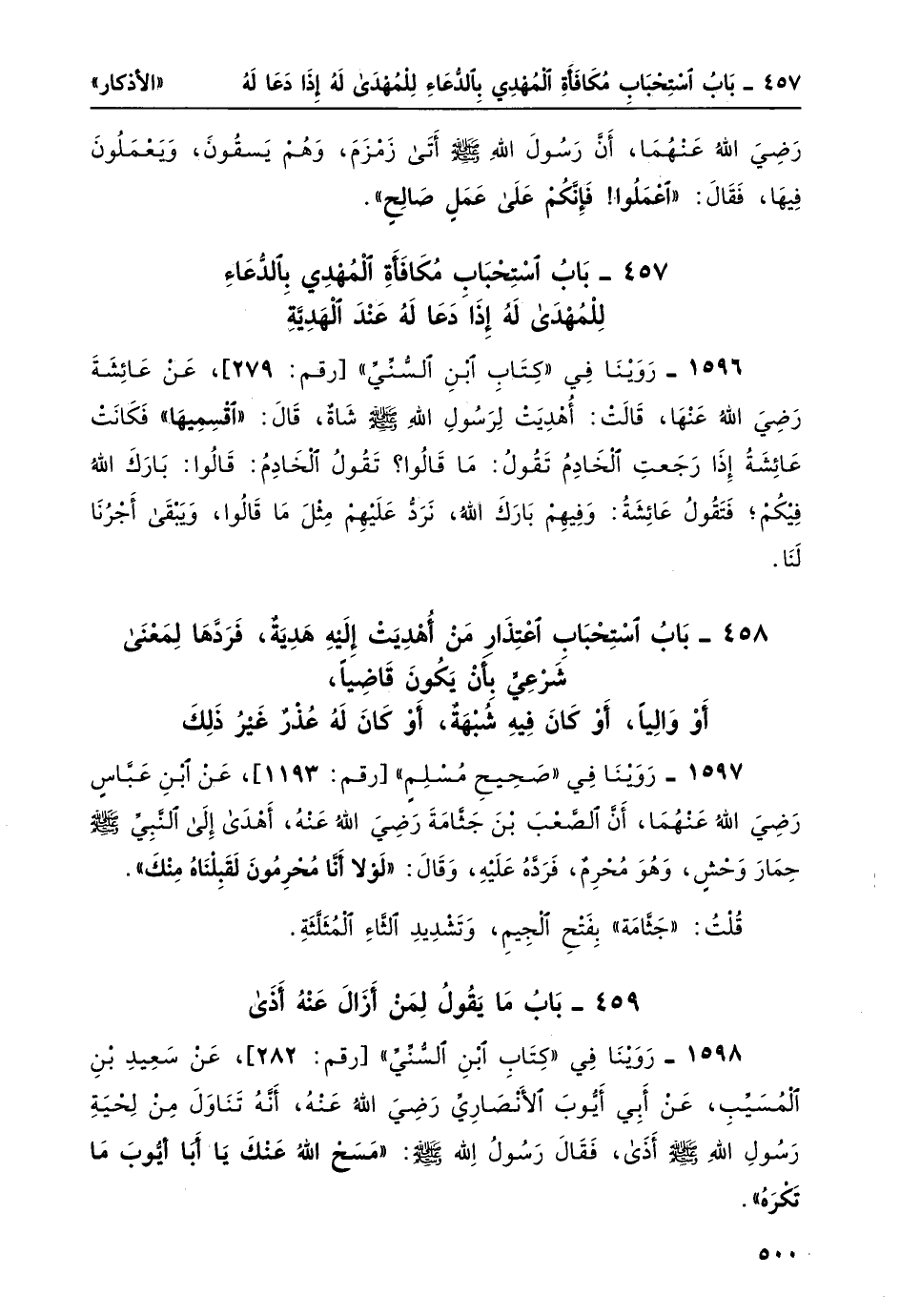 1596- رَوَيْنَا في "كتاب ابن السني" [رقم: 279] ، عن عائشة رضي الله عنها، قالت: أهديتُ لرسول الله صلى الله عليه وسلم شاةٌ، قال: "اقْسِمِيها" فكانت عائشةُ إذا رجعتِ الخادمُ تقولُ: ما قالُوا؟ تقولُ الخادمُ: قالوا: باركَ الله فيكم؛ فتقول عائشة: وفيهم بارك الله، نردُ عليهم مثلَ ما قالُوا، ويَبقى أجرُنا لنا.