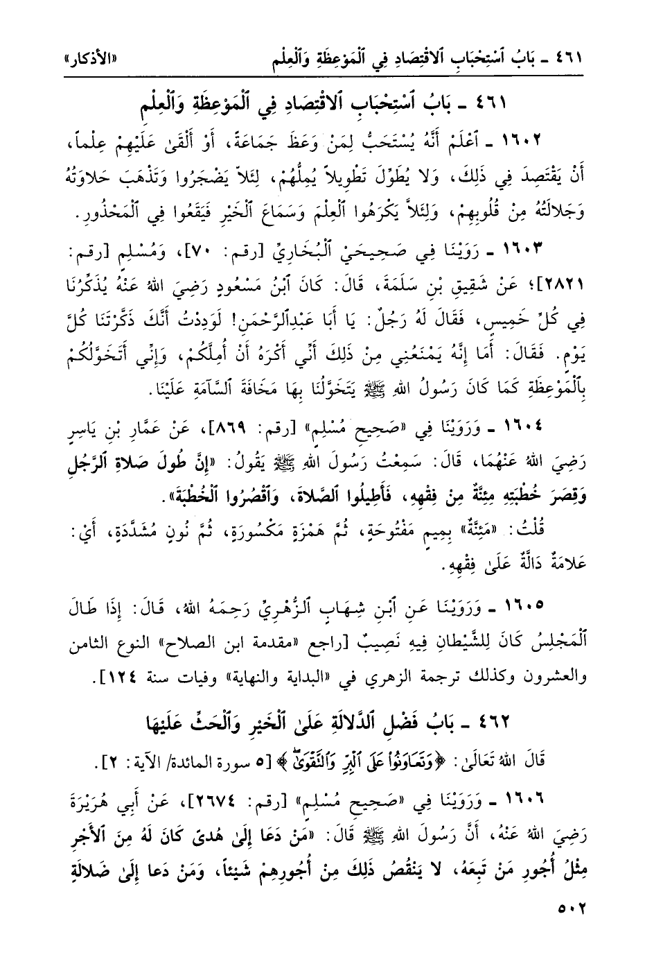 1602- اعلم أنه يُستحبّ لمن وعظَ جماعةً، أو ألقى عليهم عِلْماً، أن يقتصدَ في ذلك، ولا يُطوِّل تطويلاً يملهُم، لئلا يَضجروا وتذهبَ حلاوتهُ وجلالتهُ من قُلوبهم، ولئلا يَكْرَهُوا العلمَ وسماعَ الخير فيقعُوا في المحذور.
