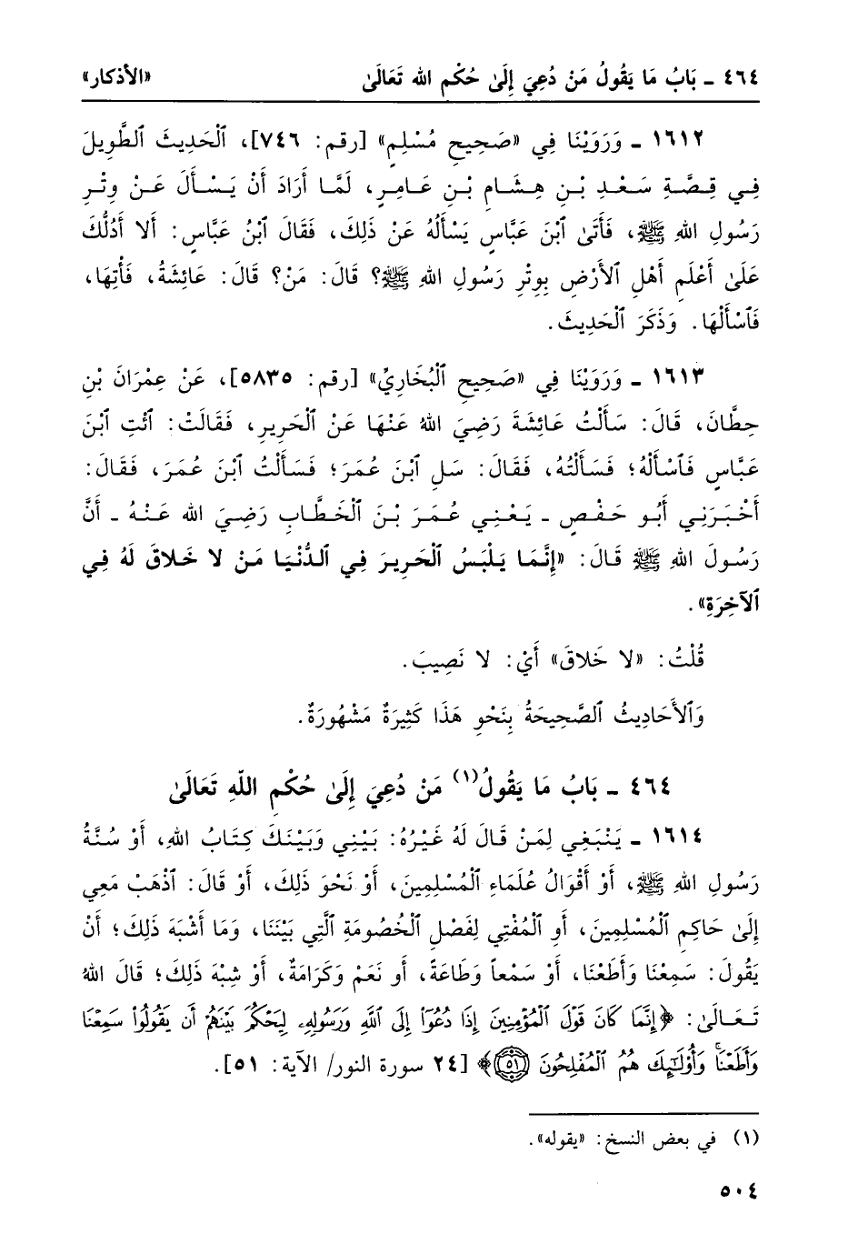 1614- ينبغي لمن قال له غيرُه: بيني وبينَك كتاب الله، أو سُنَّة رَسُولِ الله صلى الله عليه وسلم، أو أقوال علماء المسلمين، أو نحو ذلك، أو قال: اذهبْ معي إلى حاكم المسلمين، أو المفتي لفصلِ الخصومةِ التي بيننا، وما أشبَه ذلك؛ أن يقولَ: سمعنا وأطعنا، أو سمعاً وطاعةً، أو نعم وكرامةٌ، أو شبه ذلك؛ قال الله تعالى: {إِنَّمَا كَانَ قَوْلَ الْمُؤْمِنِينَ إِذَا دُعُوا إِلَى اللَّهِ وَرَسُولِهِ لِيَحْكُمَ بَيْنَهُمْ أَنْ يَقُولُوا سَمِعْنَا وَأَطَعْنَا وَأُولَئِكَ هُمُ الْمُفْلِحُونَ} [النور: 51] .