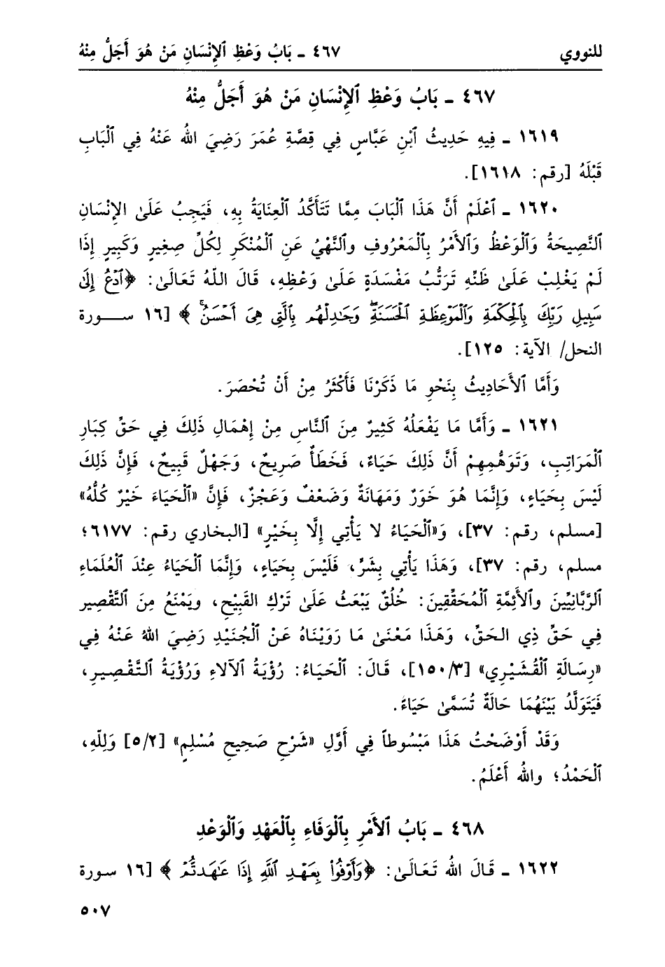 1620- اعلم أن هذا البابَ مما تتأكدُ العنايةُ بهِ، فيجبُ على الإِنسان النصيحةُ والوعظُ والأمرُ بالمعروف والنهيُ عن المنكر لكل صغير وكبير إذا لم يغلبْ على ظنهِ ترتبُ مفسدةٍ على وعظهِ، قال الله تعالى: {ادْعُ إِلَى سَبِيلِ رَبِّكَ بِالْحِكْمَةِ وَالْمَوْعِظَةِ الْحَسَنَةِ وَجَادِلْهُمْ بِالَّتِي هِيَ أَحْسَنُ} [النحل: 125] .
