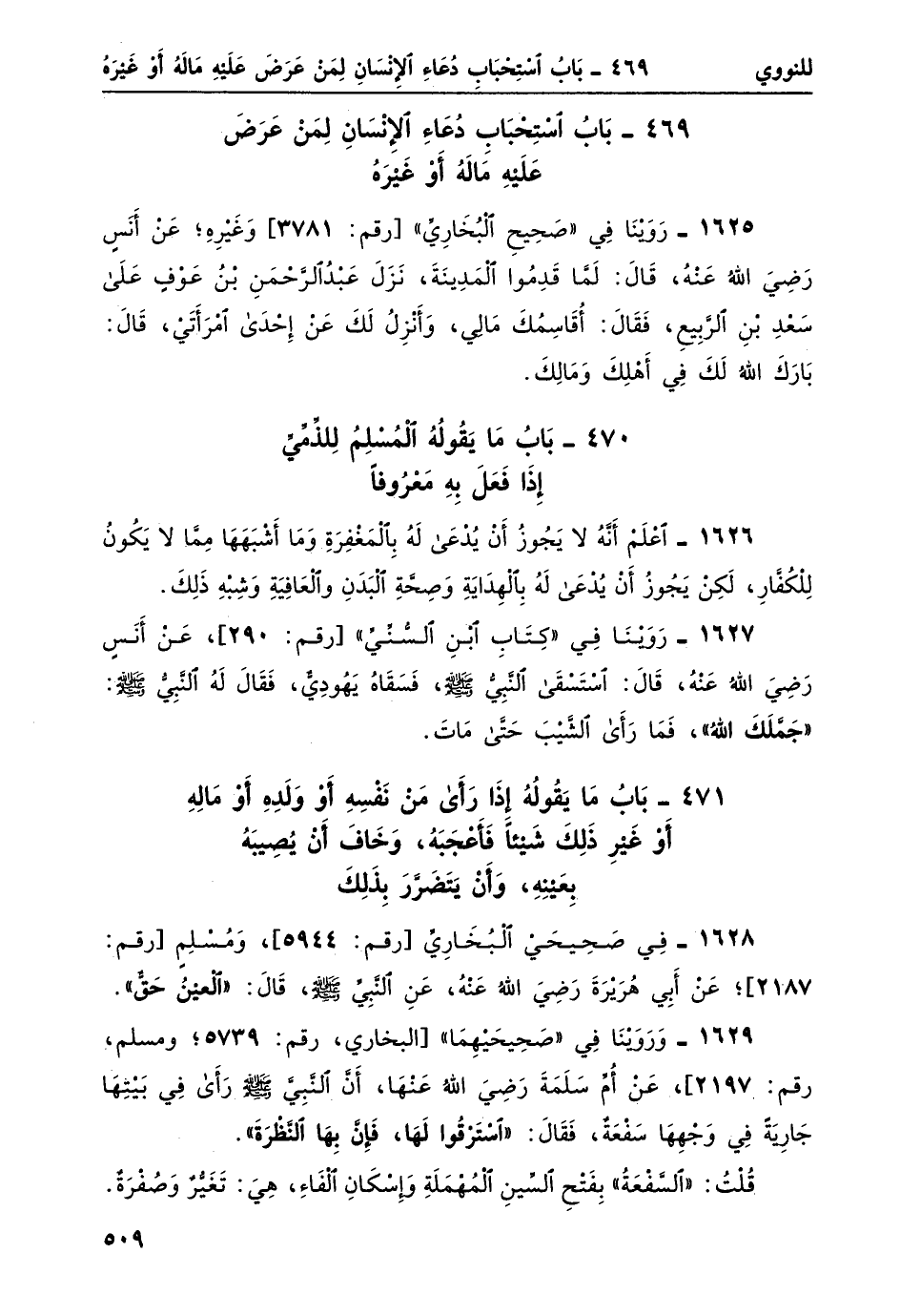 1626- اعلم أنهُ لا يجوزُ أن يُدعى لهُ بالمغفرةِ وما أشبهها مما لا يكونُ للكفارِ، لكن يجوزُ أن يُدعى له بالهداية وصحةِ البدنِ والعافية وشبهِ ذلك.