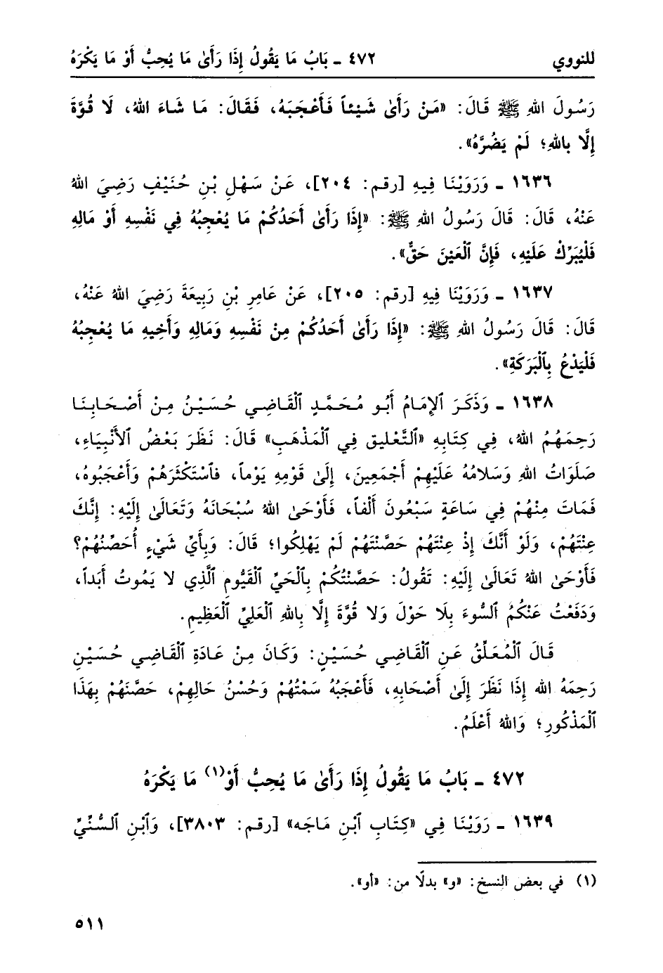 1638- وذكر الإمامُ أبو محمدٍ القاضي حُسينُ من أصحابنا رحمهمُ اللهُ، في كتابهِ "التعليق في المذهب" قال: نظرَ بعضُ الأنبياء، صلواتُ الله وسلامهُ عليهم أجمعين، إلى قومهِ يوماً، فاستكثَرهم وأعجبوهُ، فماتَ منهم في ساعةٍ سبعونَ ألفاً، فأوحى الله سبحانهُ وتعالى إليه: أنَّكَ عِنْتَهُمْ، وَلَوْ أنَّكَ إذْ عِنْتَهُمْ حَصَّنْتَهُمْ لَمْ يَهْلِكُوا؛ قال: وَبأيّ شيءٍ أُحَصّنُهُمْ؟ فأوحى الله تعالى إليه: تقولُ: حَصَّنْتُكُمْ بالحَيّ القَيُّومِ الَّذي لا يموتُ أَبَدَاً، ودفعتُ عنكمُ السوءَ بِلا حولَ وَلا قوةَ إِلاَّ باللهِ العَلِيّ العَظيمِ.