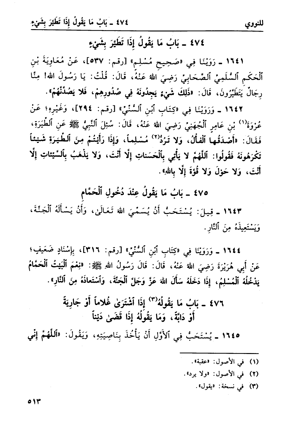 1642- وَرَوَيْنَا في "كتاب ابن السني" [رقم: 294] ، وغيره؛ عن عروة1 بن عامرٍ الجني رضي الله عنهُ، قال: سُئل النبيّ صلى الله عليه وسلم عن الطيرةِ، فقال: "أصْدَقُها الفألُ، ولا ترد 2 مُسْلِماً، وَإذَا رَأيْتُمُ مَنْ الطيرةِ شَيْئاً تكرهونهُ فَقولُوا: اللَّهُم لا يأتِي بالحَسَناتِ إِلاَّ أَنْتَ، وَلا يذهبُ بالسَّيِّئاتِ إِلاَّ أنْتَ، وَلا حَوْلَ وَلا قُوَّةَ إِلاَّ بالله".