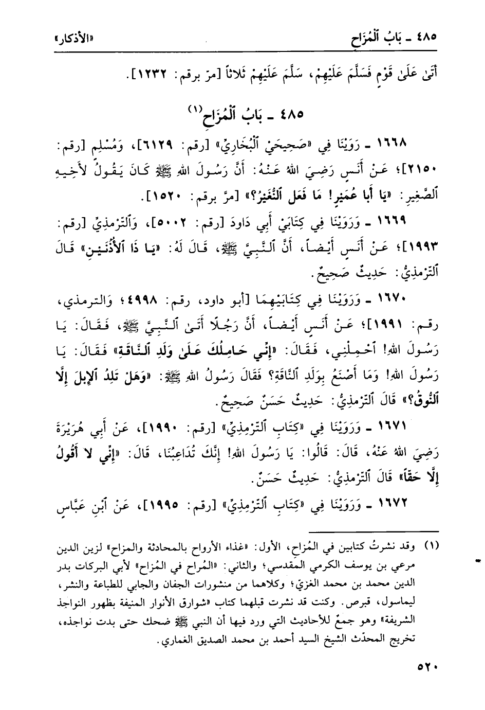 1 وقد نشرتُ كتابين في المزاح، الأول: "غذاء الأرواح بالمحادثة والمزاح" لزين الدين مرعي بن يوسف الكرمي المقدسي؛ والثاني: "الْمُرَاح في الْمُزاح" لأبي البركات بدر الدين محمد بن محمد الغزي؛ وكلاهما من منشورات الجفان والجابي للطباعة والنشر، ليماسول، قبرص. وكنت قد نشرت قبلهما كتاب "شوارق الأنوار المنيفة بظهور النواجذ الشريفة" وهو جمع للأحاديث التي ورد فيها أن النبي صلى الله عليه وسلم ضحك حتى بدت نواجذه، تخريج المحدث الشيخ السيد أحمد بن محمد الصديق الغماري.