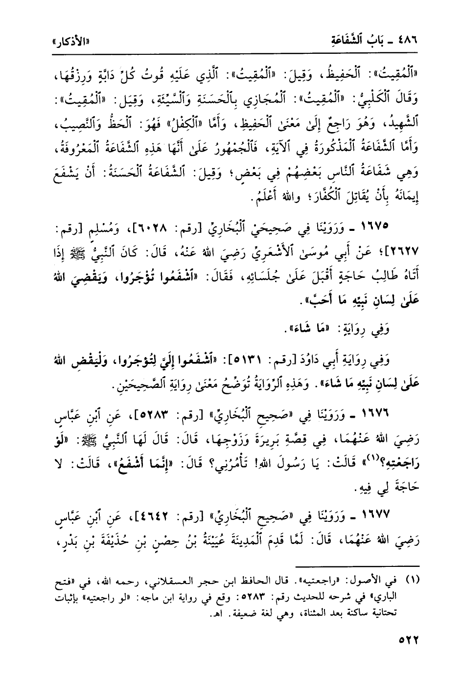1676- وروينا في صحيح البخاري [رقم: 5283] ، عن ابن عباس رضي الله عنهما، في قصة بريرة وزوجها، قال: قال لها النبيّ صلى الله عليه وسلم: "لو راجعته"؟ 1 قالت: يا رسول الله! تأمرني؟ قال: "إنما أشْفَعُ"، قالتْ: لا حاجةَ لي فيه.