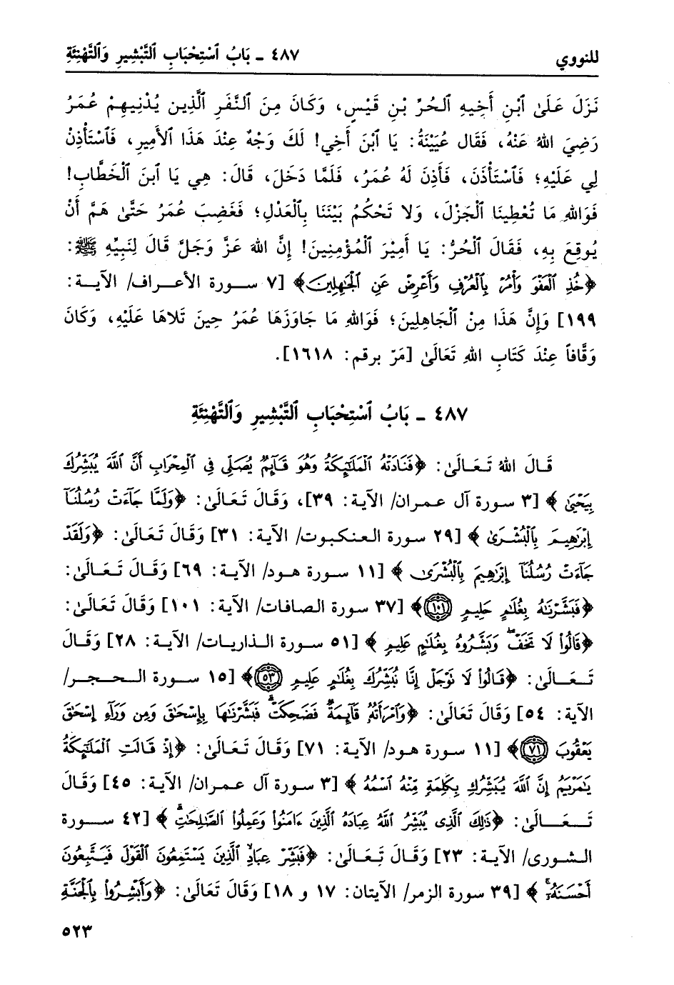 قال الله تعالى: {فَنَادَتْهُ الْمَلَائِكَةُ وَهُوَ قَائِمٌ يُصَلِّي فِي الْمِحْرَابِ أَنَّ اللَّهَ يُبَشِّرُكَ بِيَحْيَى} [آل عمران: 39] ، وقال تعالى: {وَلَمَّا جَاءَتْ رُسُلُنَا إِبْرَاهِيمَ بِالْبُشْرَى} [العنكبوت: 31] وقال تعالى: {وَلَقَدْ جَاءَتْ رُسُلُنَا إِبْرَاهِيمَ بِالْبُشْرَى} [هود: 69] وقال تعالى: {فَبَشَّرْنَاهُ بِغُلَامٍ حَلِيمٍ} [الصفات: 101] وقال تعالى: {قَالُوا لَا تَخَفْ وَبَشَّرُوهُ بِغُلَامٍ عَلِيمٍ} [الذاريات: 28] وقال تعالى: {قَالُوا لَا تَوْجَلْ إِنَّا نُبَشِّرُكَ بِغُلَامٍ عَلِيمٍ} [الحجر: 54] وقال تعالى: {وَامْرَأَتُهُ قَائِمَةٌ فَضَحِكَتْ فَبَشَّرْنَاهَا بِإِسْحَاقَ وَمِنْ وَرَاءِ إِسْحَاقَ يَعْقُوبَ} [هود: 71] وقال تعالى: {إِذْ قَالَتِ الْمَلَائِكَةُ يَا مَرْيَمُ إِنَّ اللَّهَ يُبَشِّرُكِ بِكَلِمَةٍ مِنْهُ اسْمُهُ} [آل عمران: 45] وقال تعالى: {ذَلِكَ الَّذِي يُبَشِّرُ اللَّهُ عِبَادَهُ الَّذِينَ آَمَنُوا وَعَمِلُوا الصَّالِحَاتِ} [الشورى: 23] وقال تعالى: {فَبَشِّرْ عِبَادِ، الَّذِينَ يَسْتَمِعُونَ الْقَوْلَ فَيَتَّبِعُونَ أَحْسَنَهُ} [الزمر/ الآيتان: 17، 18] وقال تعالى: {وَأَبْشِرُوا بِالْجَنَّةِ