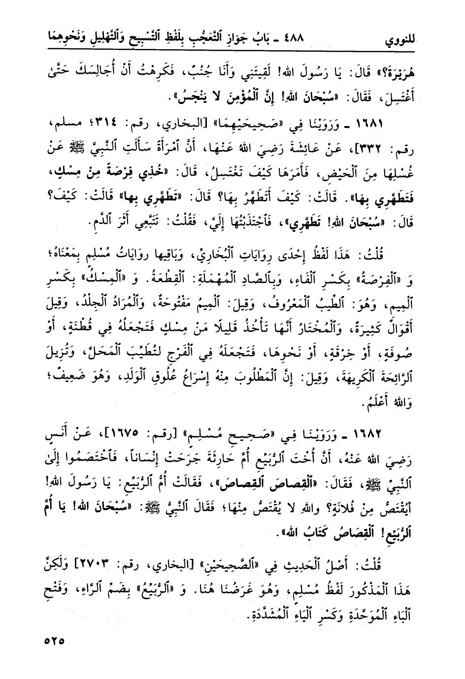 1681- وَرَوَيْنَا في صحيحيهما [البخاري، رقم: 314؛ مسلم، رقم: 332] ، عن عائشة رضي الله عنها، أن امرأة سألتِ النبيَّ صلى الله عليه وسلم عن غُسلها من الحيض، فأمرَها كيف تغتسلُ، قال: "خُذي فِرْصةً مِنْ مسكٍ، فَتَطَهَّري بِهَا". قالت: كيف أتطهرُ بها؟ قال: "تَطَهرِي بِهَا" قالت: كَيْفَ؟ قال: "سبْحانَ اللَّهِ! تَطَهَّرِي" فاجتذبتُها إلَيَّ، فقلتُ: تتبعي أثرَ الدم.