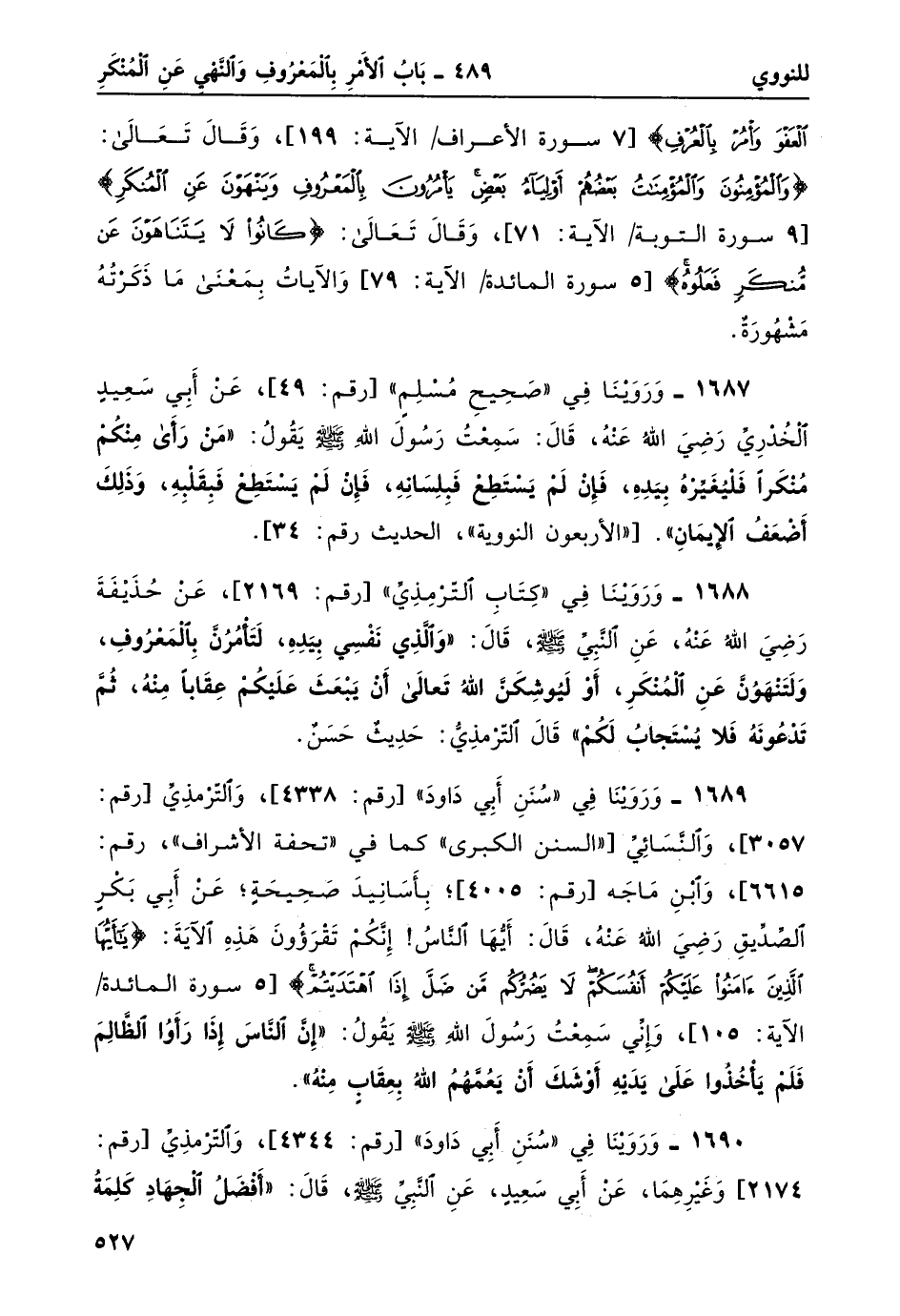 1687- وروينا في "صحيح مسلم" [رقم: 49] ، عن أبي سعيد الخدري رضي الله عنهُ، قال: سمعتُ رسول الله صلى الله عليه وسلم يقولُ: "مَنْ رأى مِنْكُمْ مُنْكَراً فليُغيرهُ بيدهِ، فإنْ لَم يَسْتَطِعْ فَبِلِسانِهِ، فإنْ لَمْ يَسْتَطِعْ فَبِقَلْبِهِ، وَذلكَ أضْعَفُ الإِيمَانِ". [الأربعون النووية، الحديث رقم: 34] .