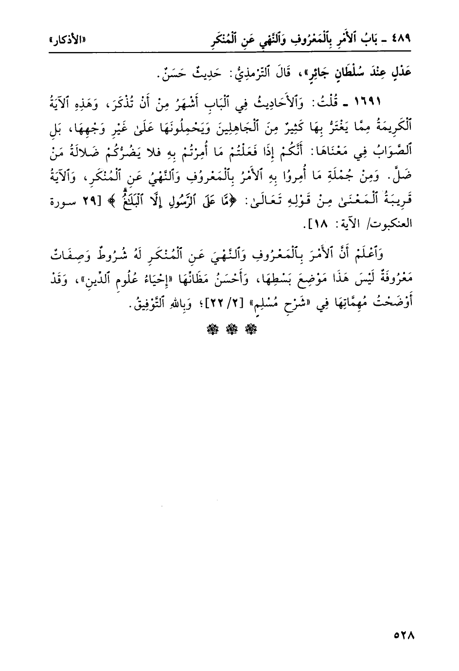 واعلم أن الأمر بالمعروف والنهي عن المنكر له شروط وصفاتٌ معروفةٌ ليس هذا موضع بسطها، وأحسنُ مظانّها "إحياءُ علوم الدين"، وقد أوضحتُ مهماتها في شرح مسلم [2/ 22] ؛ وبالله التوفيق.