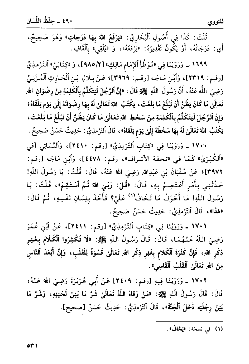 1699- وَرَوَيْنَا في "موطأ الإِمام مالك" [2/ 985] ، وكتابي الترمذي [رقم: 2319] ، وابن ماجه [رقم: 3969] ؛ عن بلال بن الحارث المزني رضي الله عنه، أن رسول الله صلى الله عليه وسلم قال: "إنَّ الرَّجُلَ لَيَتَكَلَّمُ بالكَلِمَةِ مِنْ رِضْوَانِ اللَّهِ تَعالى ما كان يظنُ أنْ تَبْلُغَ مَا بَلَغَتْ، يكتبُ اللَّهُ تَعالى لَهُ بِهَا رِضْوَانَهُ إلى يَوْمِ يلقاهُ؛ وَإِنَّ الرَّجُلَ لَيَتَكَلَّمُ بالكَلِمَةِ مِنْ سخطِ الله تعالى ما كان يظنُ أنْ تبلغَ مَا بَلَغَتْ، يكتبُ اللهُ تَعالى لهُ بِهَا سخطهُ إلى يومِ يلقاهُ"، قال الترمذي: حديثٌ حسنٌ صحيحٌ.