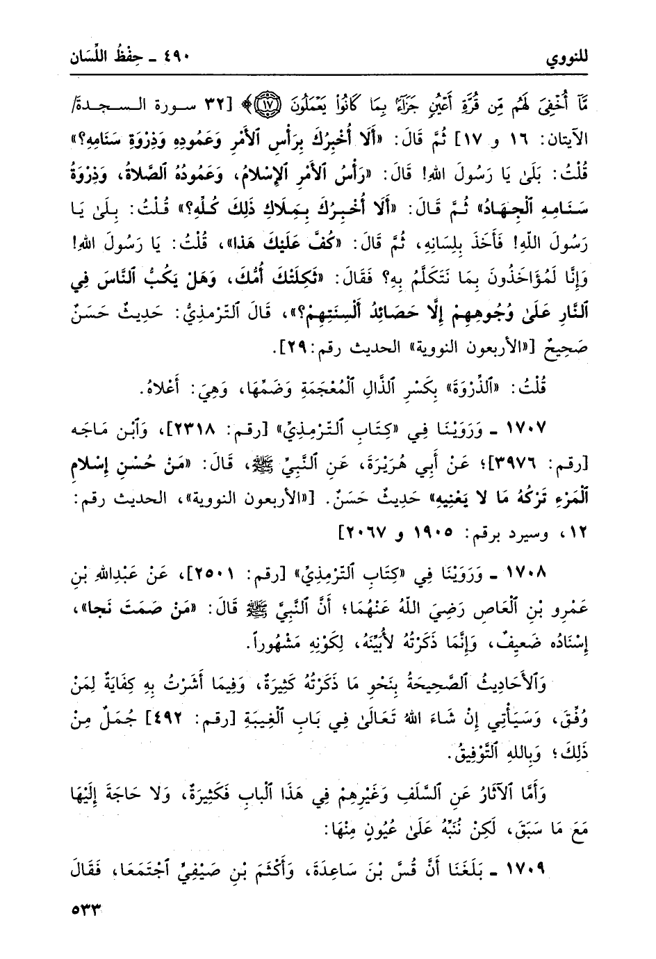 مَا أُخْفِيَ لَهُمْ مِنْ قُرَّةِ أَعْيُنٍ جَزَاءً بِمَا كَانُوا يَعْمَلُونَ} [السجدة: 16، 17] ثُمَّ قال: "ألا أُخْبِرُكَ برأس الأمر وعموده وذروة سنامه"؟ قلتُ: بلى يا رسول الله! قال: "رأس الأمر الإسلام، وعمودهُ الصلاة، وذورة سنامه الجهاد" ثم قال: "ألا أُخبرك بملاكِ ذلك كله"؟ قلتُ: بلى يا رسول الله! فأخذ بلسانه، ثم قال: "كُفَّ عَلَيْكَ هَذَا"، قلت: يا رسلو الله! وإنما لمؤاخذون بما تتكلم به؟ فقال: "ثَكِلَتْكَ أُمك، وَهَلْ يَكُبُّ النَّاسَ في النَّارِ على وُجُوهِهِمْ إِلاَّ حَصَائِدُ ألْسِنَتِهِمْ"؟، قال الترمذي: حديثٌ حسنٌ صحيحٌ ["الأربعون النووية" الحديث رقم: 29] .