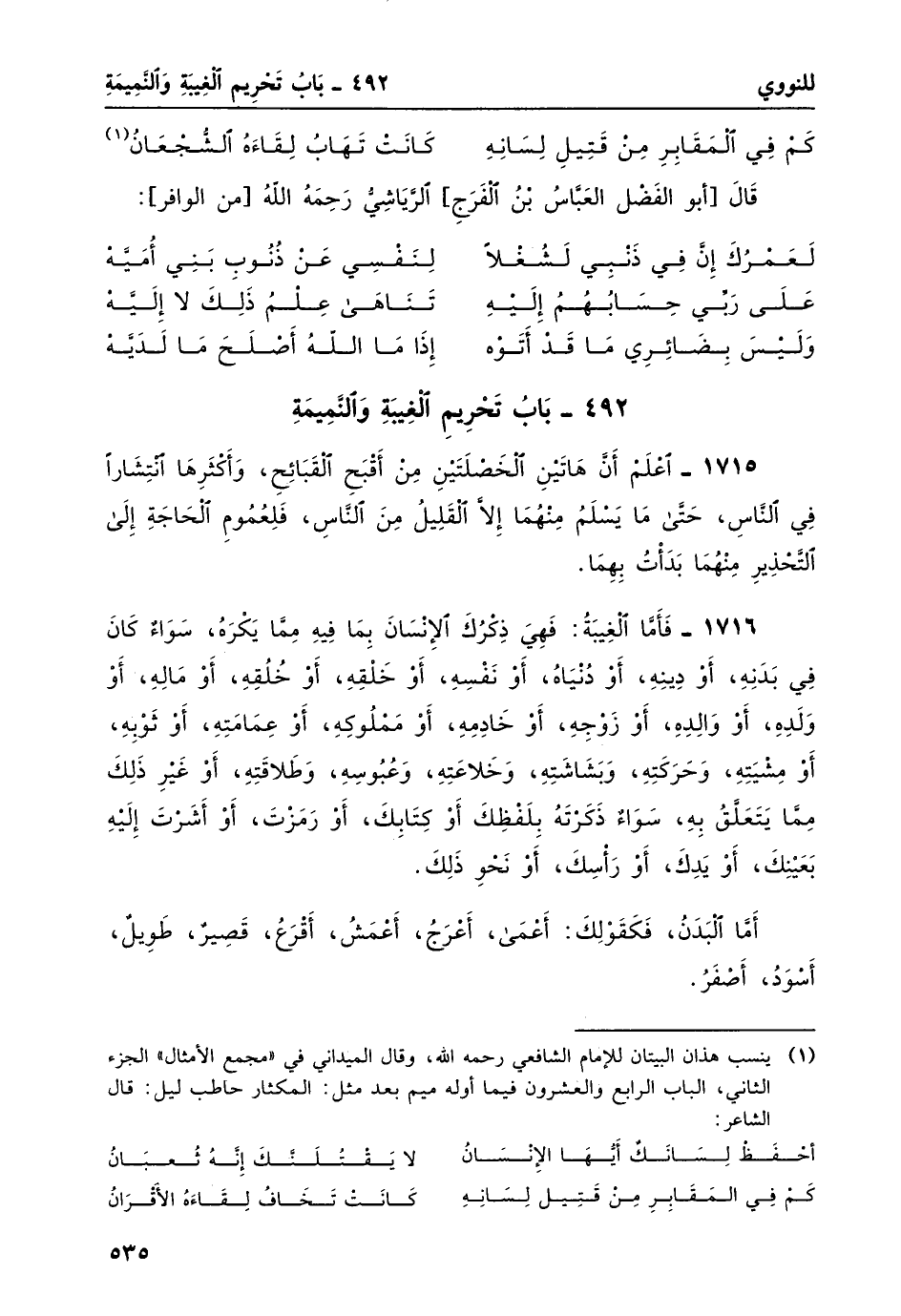 1715- اعلم أن هاتين الخصلتين من أقبح القبائح، وأكثرها انتشاراً في الناس، حتى ما يسلمُ منهما إلا القليلُ من الناس، فلعمومِ الحاجةِ إلى التحذير منهما بدأتُ بهما.