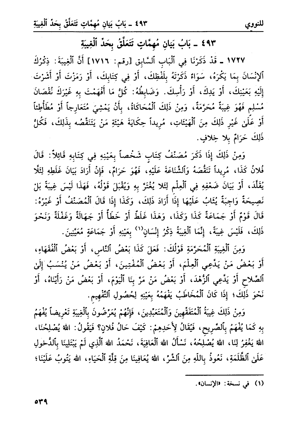 ومن ذلك إذا ذَكرَ مُصنفُ كتابٍ شخصاً بعينه في كتابه قائلاً: قال فلانُ كذا، مريدًا تنقصهُ والشناعةَ عليهِ، فهو حرامٌ، فإن أرادَ بيانَ غلطهِ لئلا يُقلَّدَ، أو بيانَ ضعفه في العلم لئلا يُغترّ به ويُقبل قولهُ، فهذا ليس غيبة بل نصيحة واجبةٌ يثابُ عليها إذا أرادَ ذلك، وكذا إذا قال المصنف أو غيره: قال قوم أو جماعةٌ كذا وكذا، وهذا غلطٌ أو خطأ أو جهالةٌ وغفلةٌ ونحو ذلك، فليس غيبة، إنما الغيبة ذكر إنسانٌ1 بعينه أو جماعةٍ معينين.